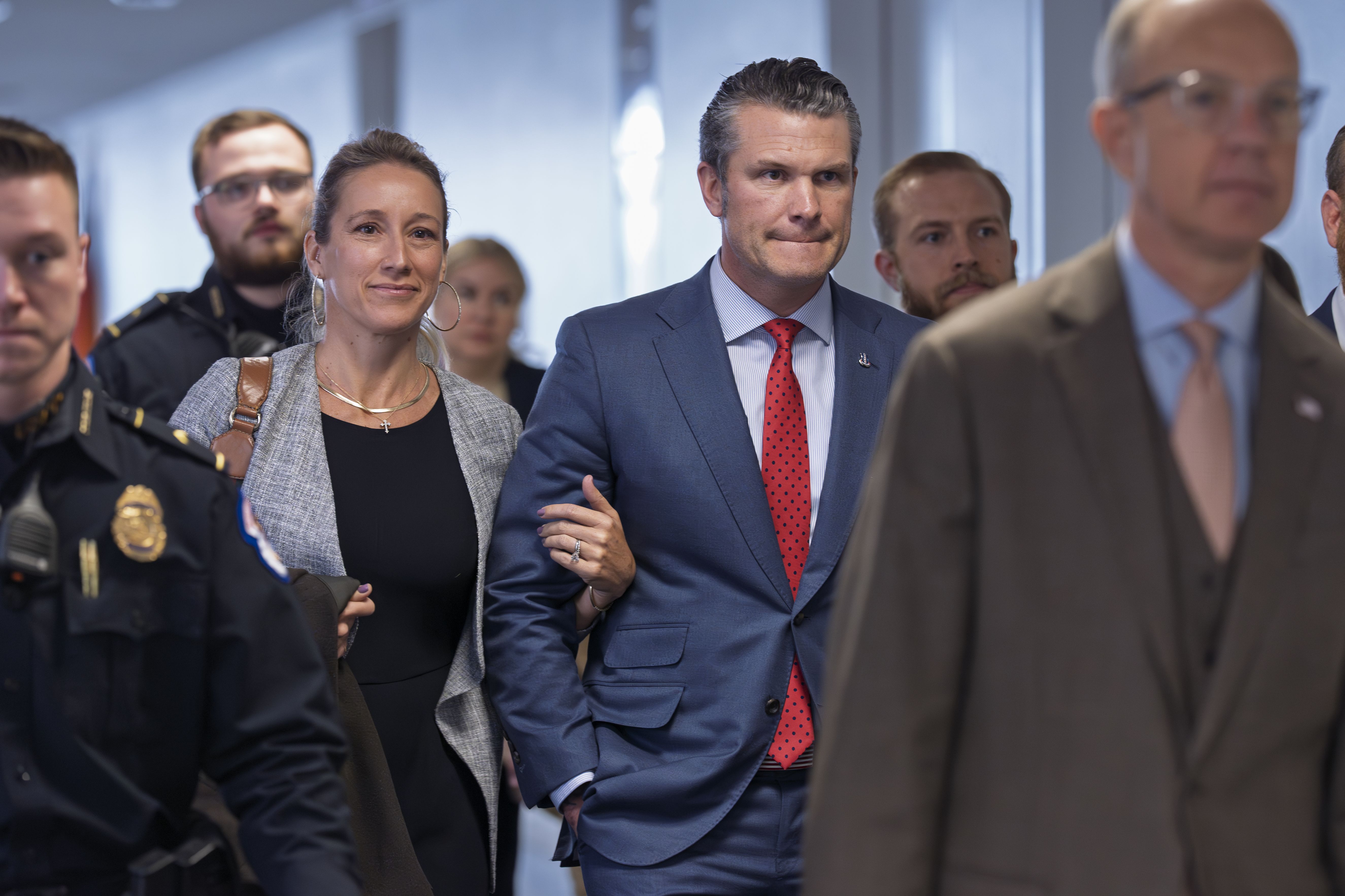 Pete Hegseth, center right, President-elect Donald Trump's nominee to be defense secretary, joined by his wife Jennifer Rauchet, arrives to meet with Sen. Mike Rounds, R-S.D., a member of the Senate Armed Services Committee, at the Capitol in Washington, December 5, 2024. (Photo by J. Scott Applewhite/AP Photo)