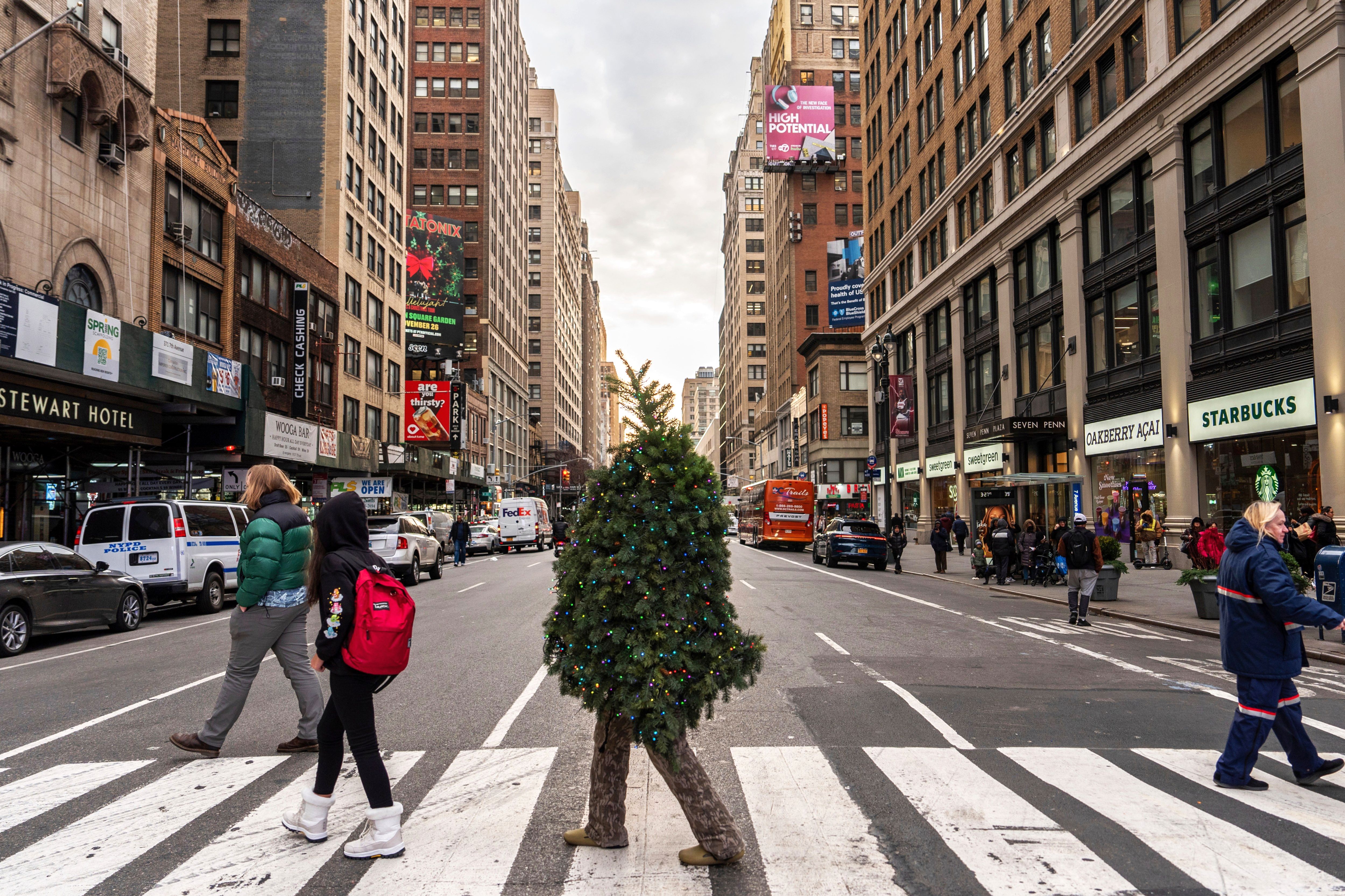 Tommy Liberto, known as Mr. Christmas Tree, crosses Seventh Avenue while visiting New York for the tenth year from Bel Air, Md., Wednesday, December 4, 2024. (Photo by Julia Demaree Nikhinson/AP Photo)