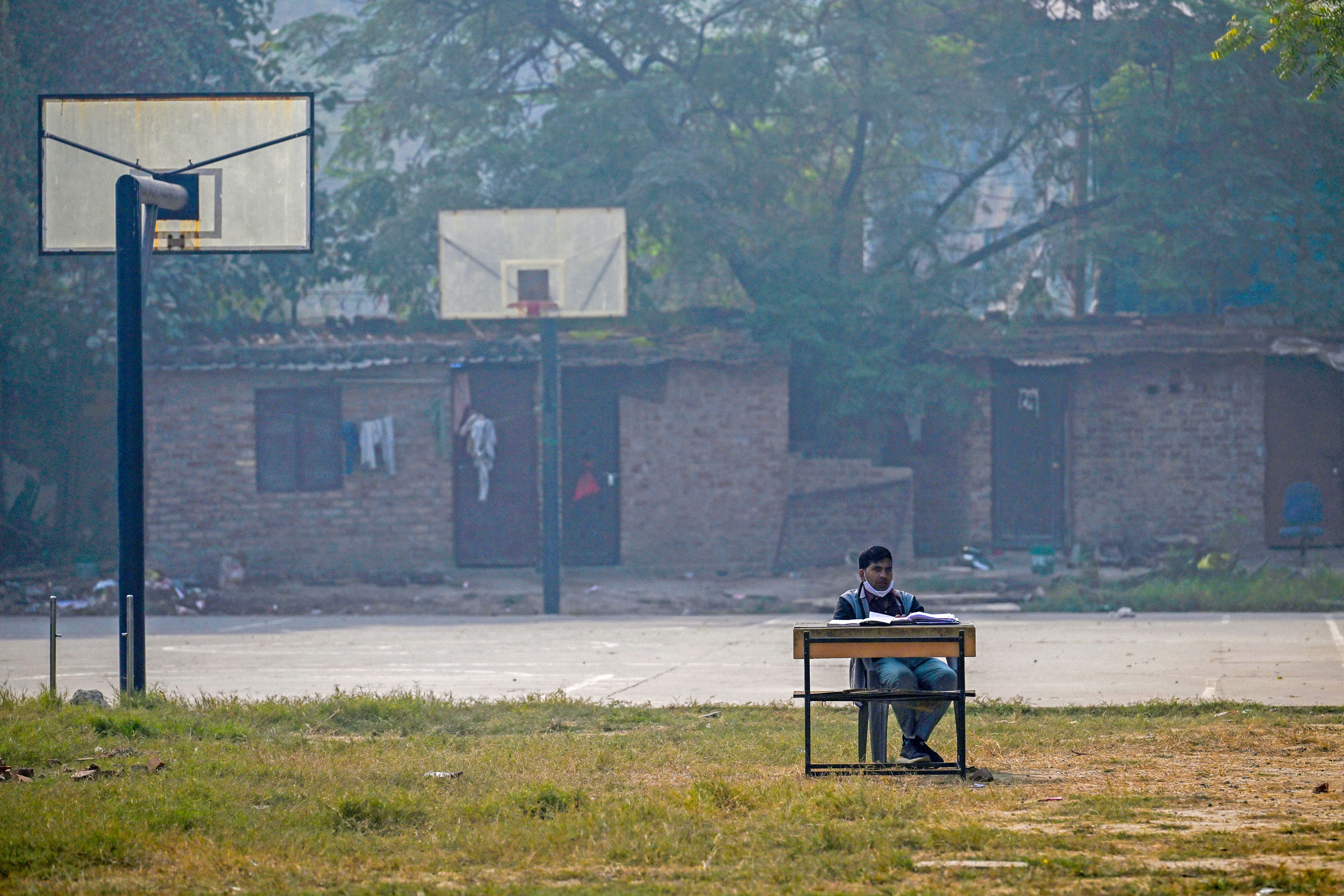 A school teacher conducts an online class near a basketball court at Swami Sivananda Memorial Institute in New Delhi on November 22, 2024. Now a weary annual ritual, keeping children at home and moving lessons online for days at a time during the peak of the smog crisis in winter ostensibly helps protect the health of the city's youth. (Photo by Arun Sankar/AFP Photo)