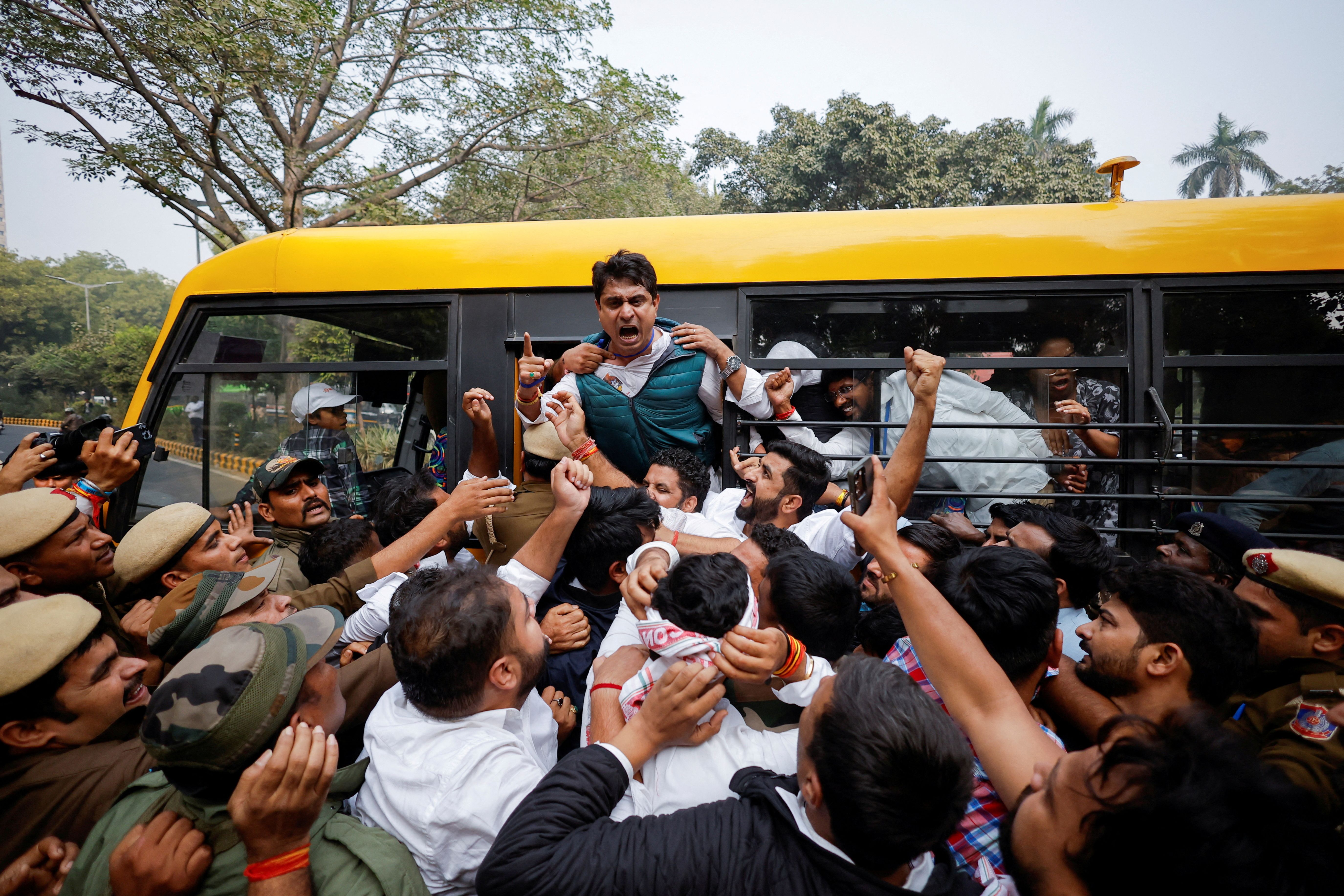 Police detain supporters of India's main opposition Congress party during a protest against Indian billionaire Gautam Adani, after he was indicted in New York over his role in an alleged multibillion-dollar bribery and fraud scheme, in New Delhi, India on November 25, 2024. (Photo by Anushree Fadnavis/Reuters)