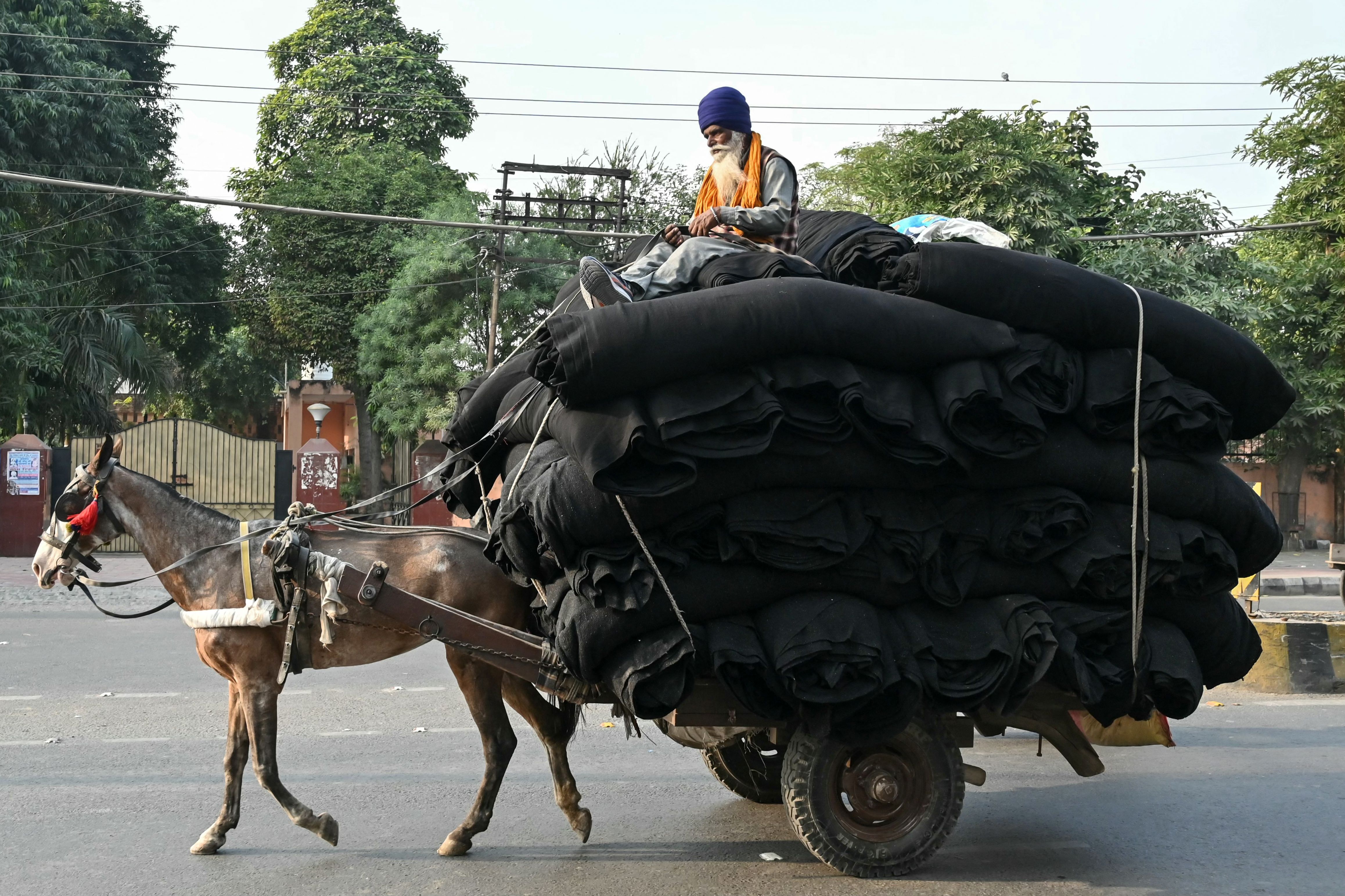A man sits atop blankets as he transports them on a horse-drawn cart through a street in Amritsar on November 29, 2024. (Photo by Narinder Nanu/AFP Photo)