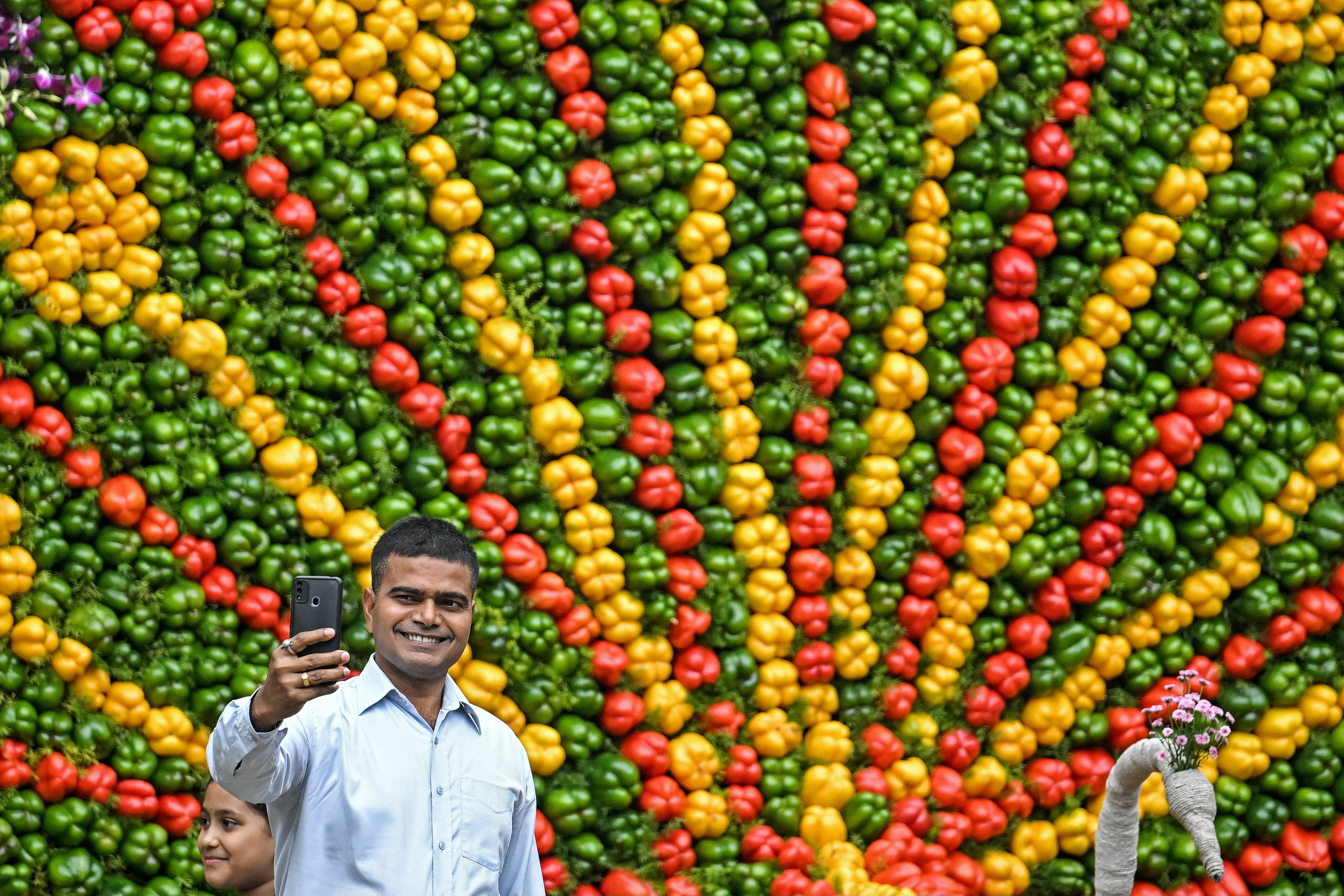 A visitor takes a photograph in front of a peacock installation made of vegetables at Cubbon Park in Bengaluru on November 30, 2024. (Photo by Idrees Mohammed/AFP Photo)