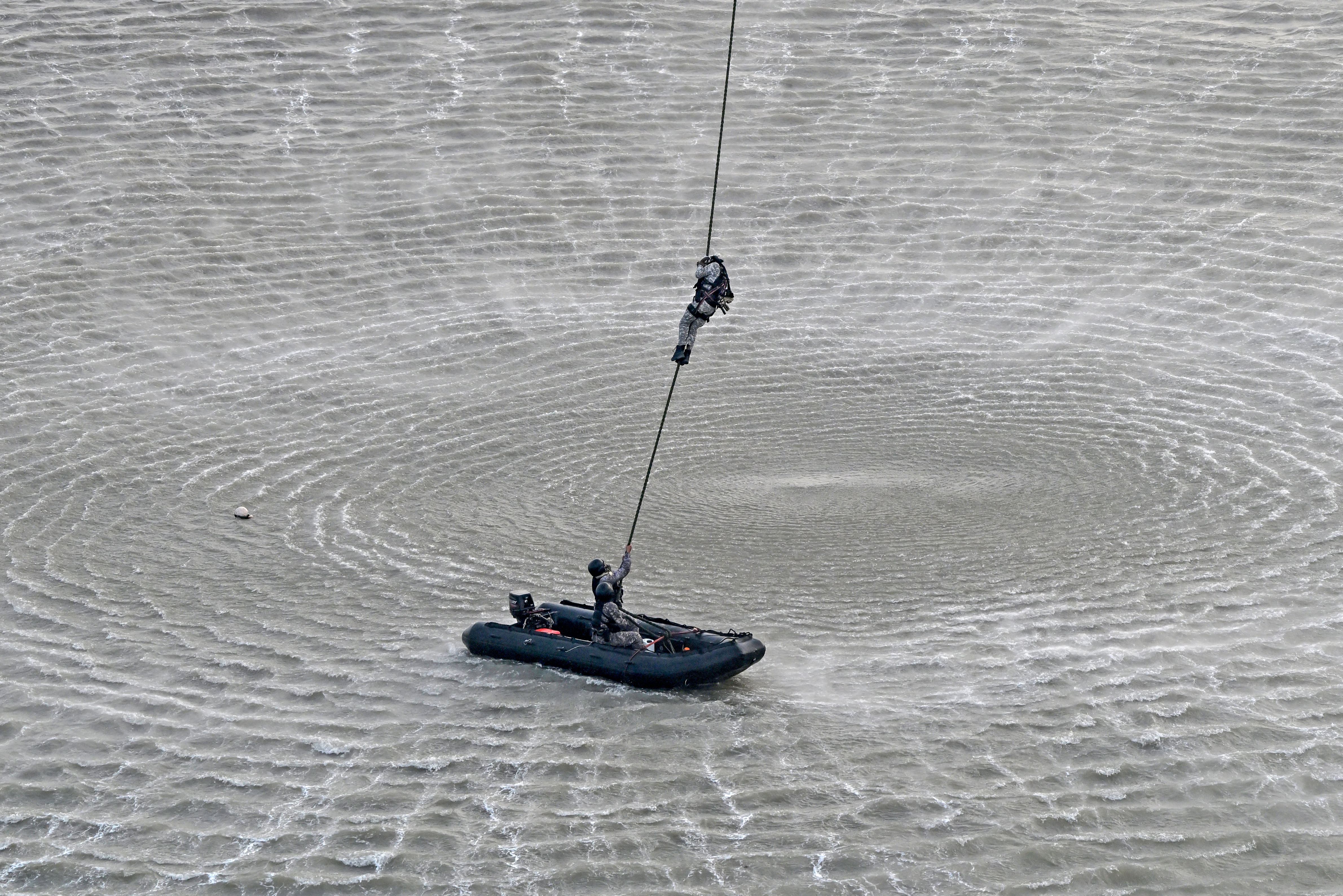 Marine Commandos (MARCOS) of the Indian Navy get down with a rope during a simulated hostage rescue operation during the rehearsal for upcoming Navy Day celebrations at the Gateway of India in Mumbai on December 1, 2024. (Photo by Indranil Mukherjee/AFP Photo)