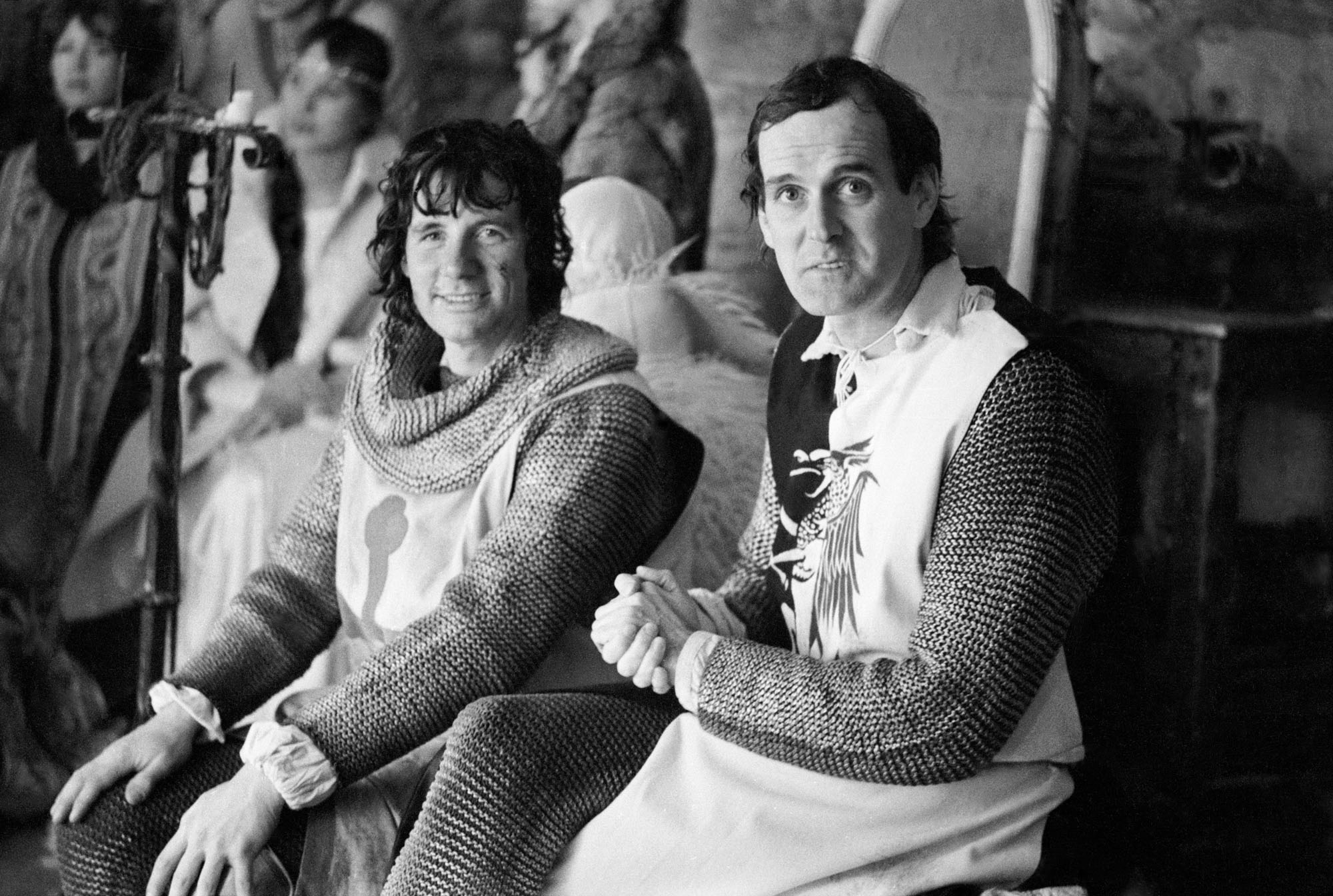 Michael Palin (left) and John Cleese, members of the Monty Python comedy group, in costume on the set of “Monty Python and the Holy Grail” on May 21, 1974. (Photo by John Downing/Express/Getty Images)