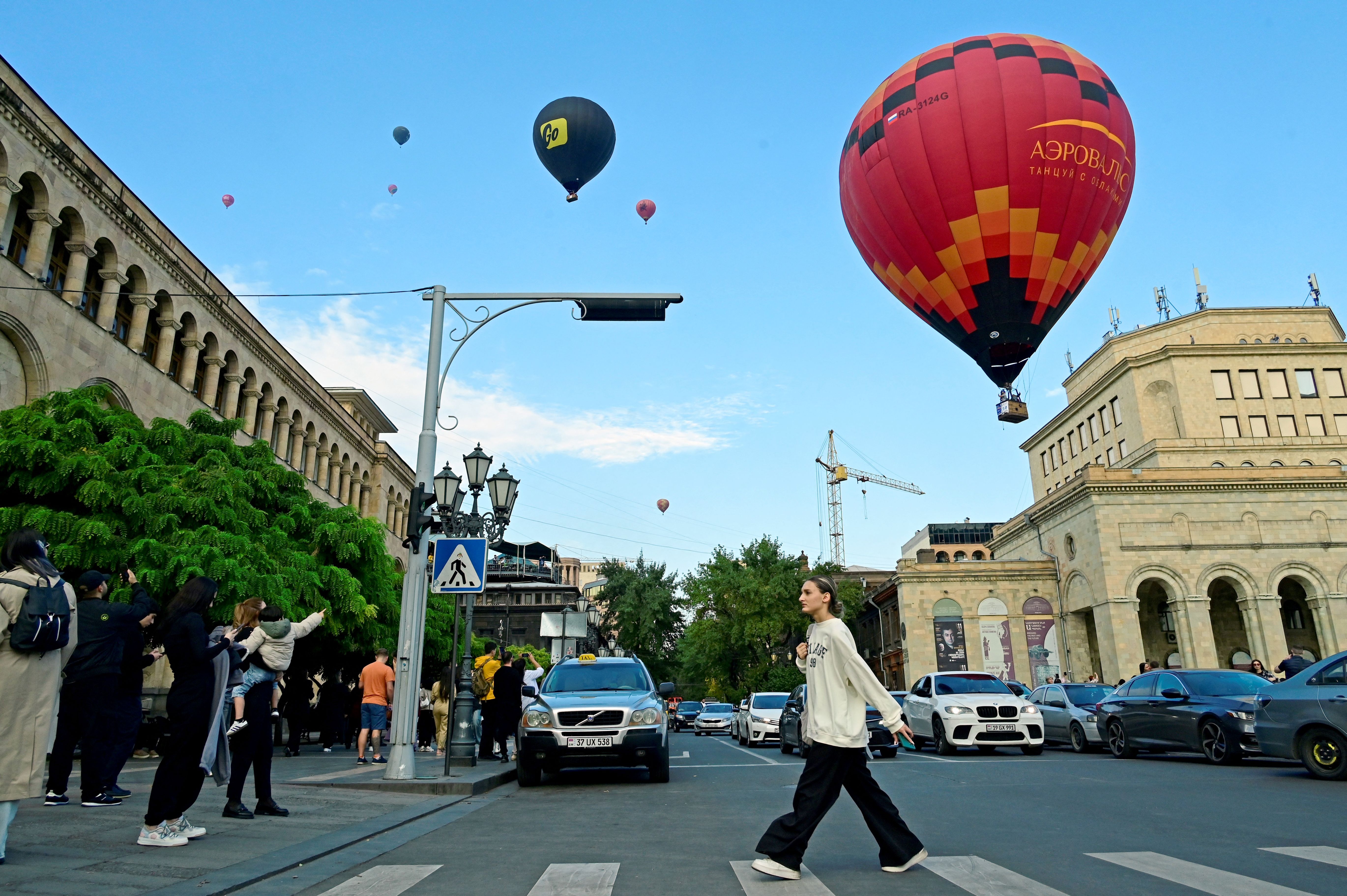 Pedestrians cross the road as hot air balloons fly over the Armenian capital during the annual balloon festival, in Yerevan, on October 15, 2024. (Photo by Karen Minasyan/AFP Photo)