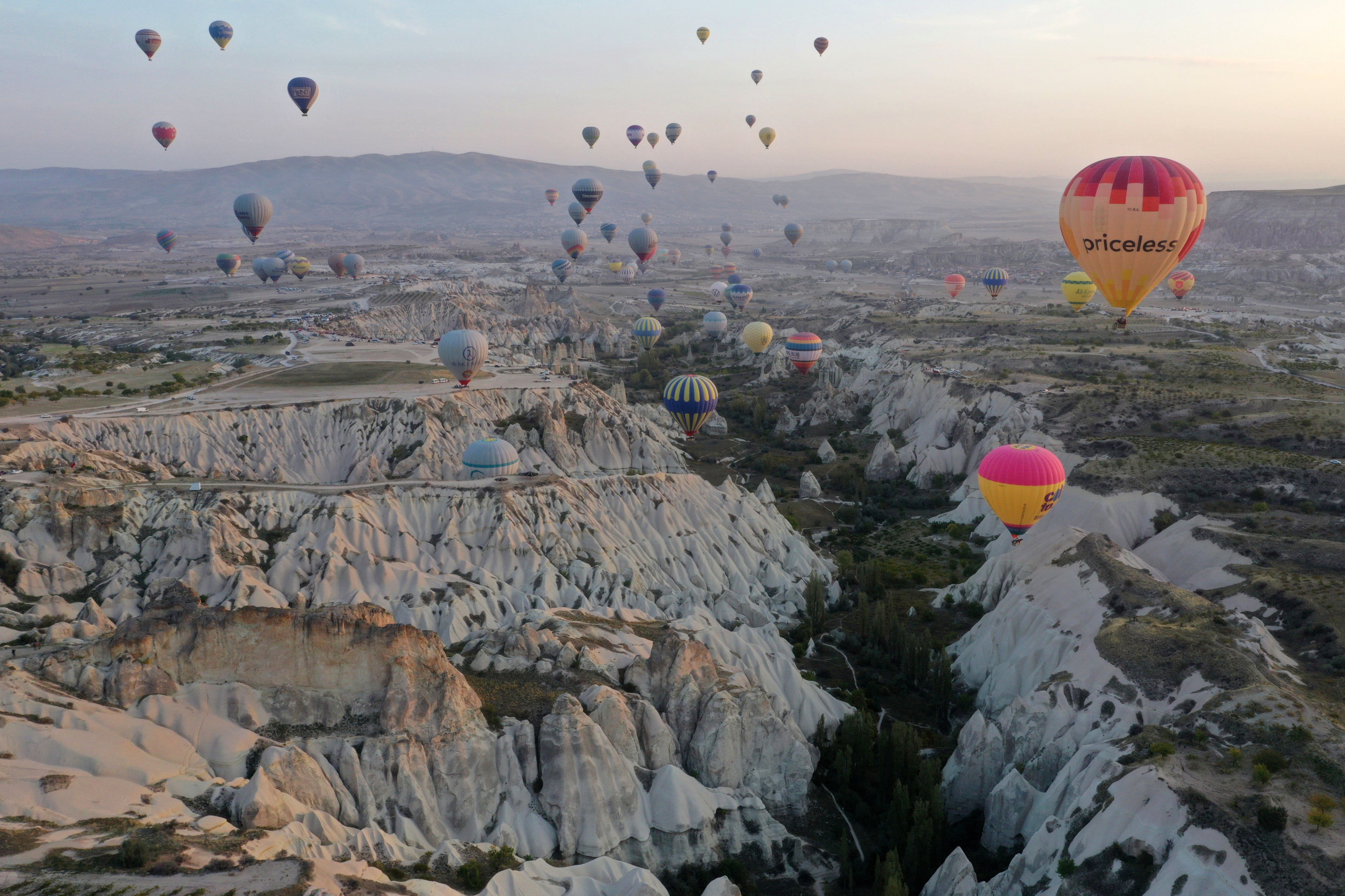 Hot air balloons fly over Cappadocia, a UNESCO World Heritage Site with historical, cultural and natural riches, in Nevsehir, Turkiye on October 14, 2024. Among the tour activities in Cappadocia, hot air balloon tour is among the most preferred activities by tourists. The number of participants in the balloon tour reached a record with 583 thousand 63 people between January-October 2024. (Photo by Behcet Alkan/Anadolu via Getty Images)