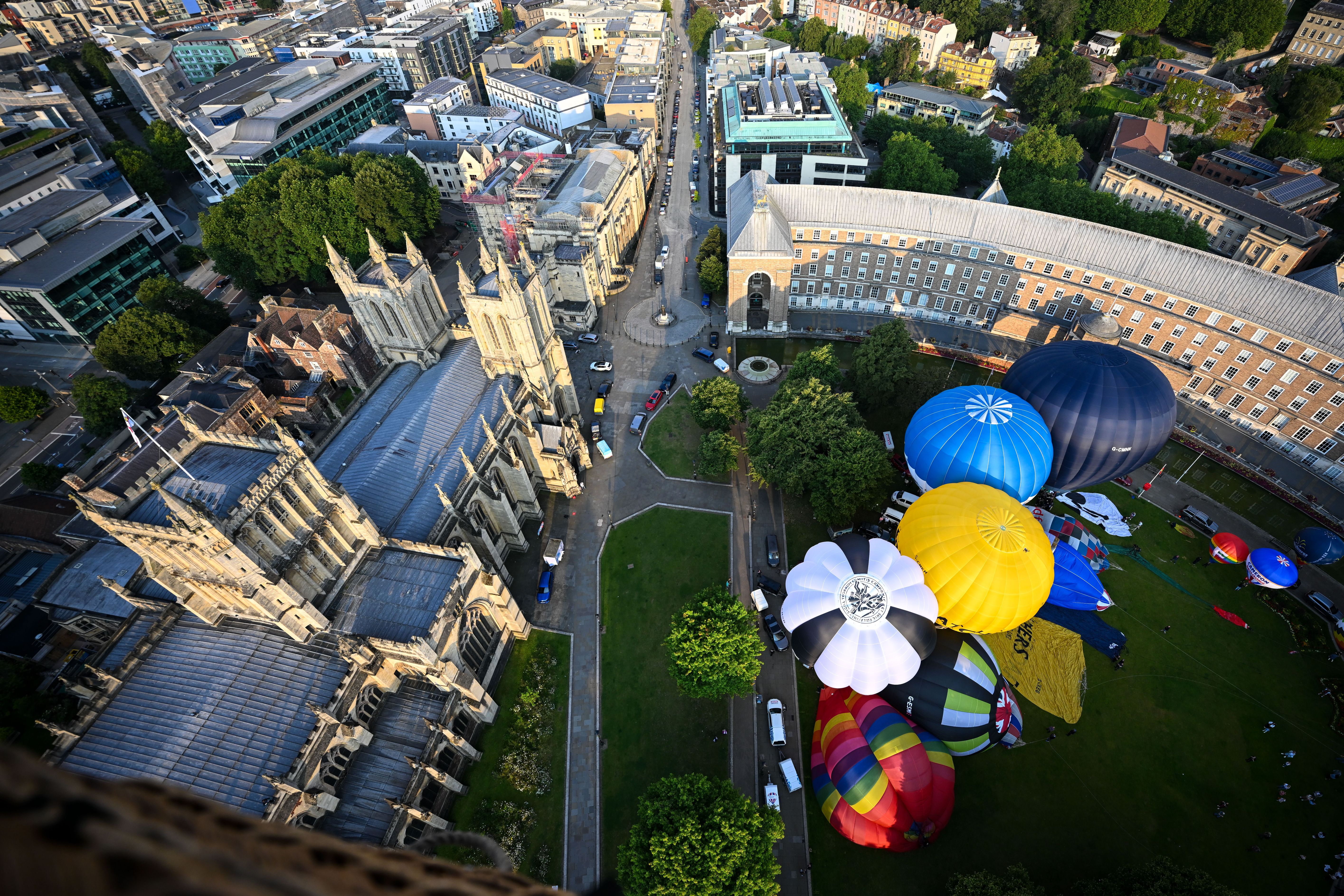 A fleet of hot air balloons take off from College Green and Queen Square to mark the countdown to the 46th Bristol International Balloon Fiesta on July 24, 2024 in Bristol, England. This year, Europe's largest hot air balloon festival takes off on Friday, August 9, and will last until Sunday, August 11, with over 140 hot air balloons ascending into the sky. (Photo by Finnbarr Webster/Getty Images)