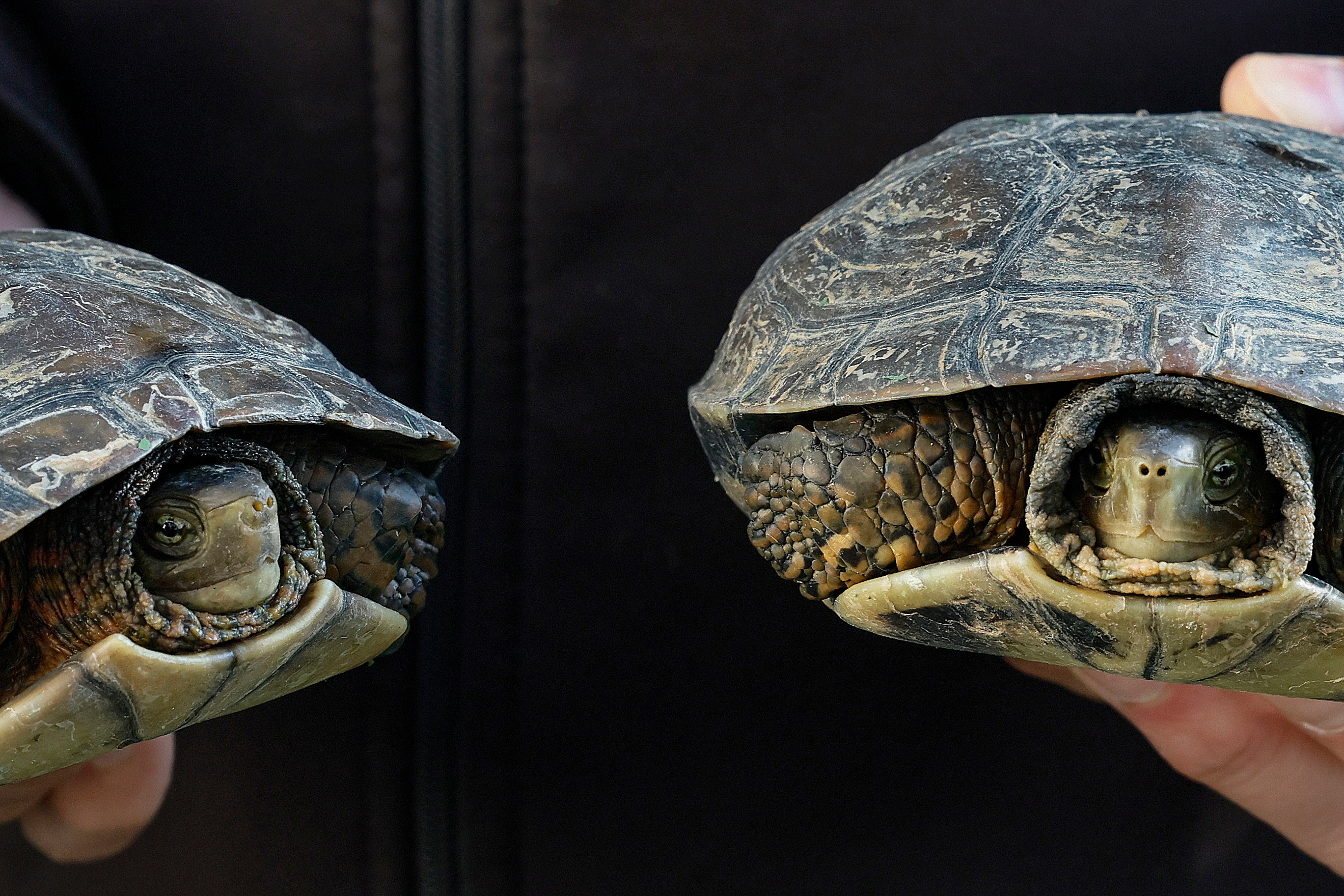 Two Iberian pond turtles are seen at the Animal Recovery Center El Saler in Valencia, Spain, 27 November 2024. More than 120 Iberian pond turtles have been rescued following the floods in Valencia after they were carried away by the current from their original habitat, appearing in towns like Paiporta and Catarroja where, almost a month later, neighbors continue finding them buried in the mud. Floods triggered by the DANA (high-altitude isolated depression) weather phenomenon hit the east of the country on 29 October 2024, devastating Valencia and neighboring provinces and leaving at least 229 people dead. (Photo by José Manuel Vidal/EPA/EFE)