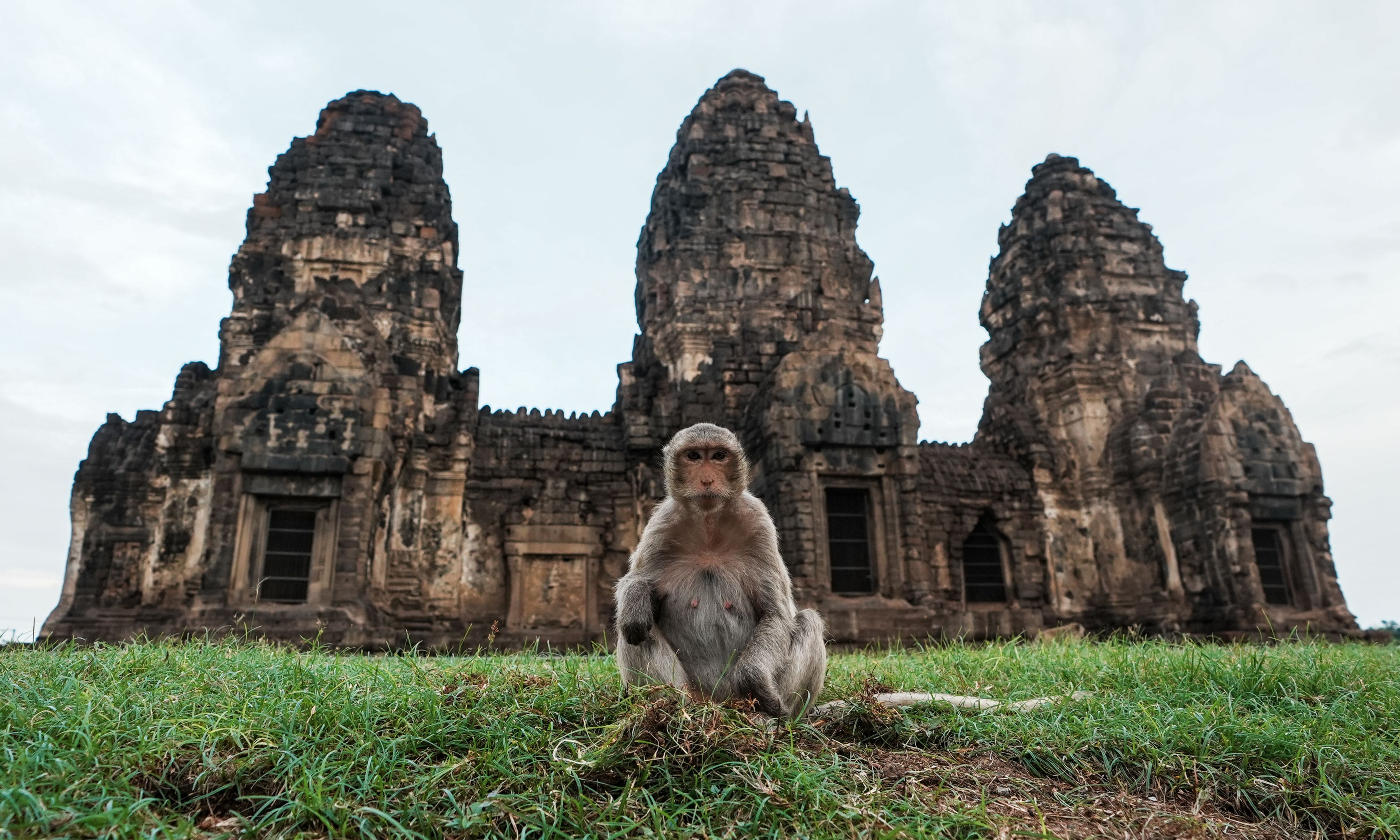 A view macaques, which have become the center of attention of tourists, are also believed to bring luck and live around Phra Prang Sam Yot Temple, which was built in the early 13th century during the Angkor period of the Khmer Empire, in Lopburi, Thailand on November 17, 2024. (Photo by Omer Taha Cetin/Anadolu via Getty Images)