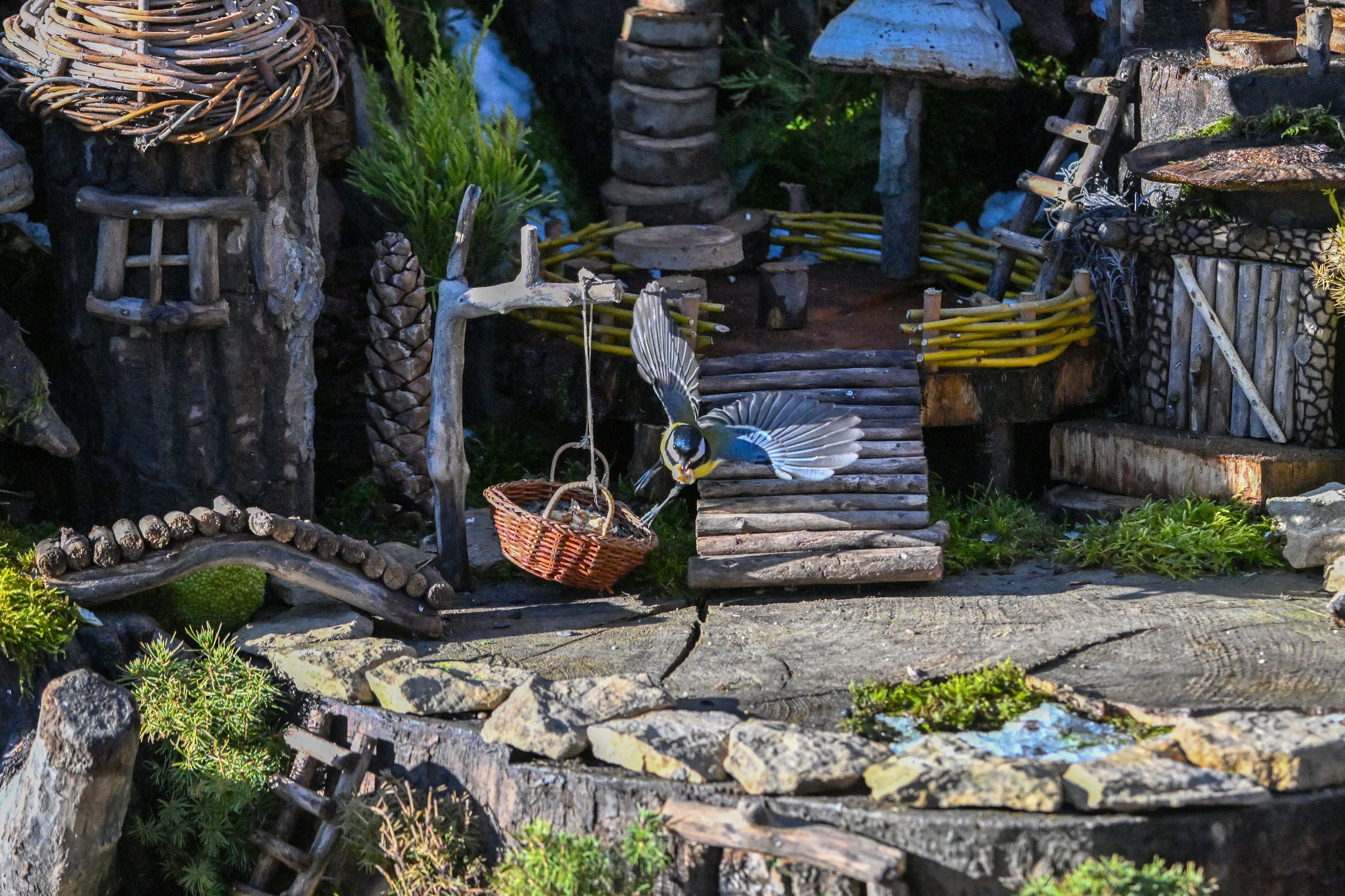 A Eurasian blue tit (Cyanistes caeruleus) leaves with a seed in its beak at the feeding ground called “Smurfs' Village” for birds and squirrels built by Hungarian artist Tamas Kanya in Budakalasz, Hungary on November 23, 2024. Kanya uses organic materials only, like agaric, bark, honey-locust, willow twigs, horse chestnuts, duck stones, small pebbles, shells, and lots of driftwood. His previous creation was completely destroyed by the flood in autumn, so he had to start designing the feeding ground from scratch again. The feeding ground covers about 15 meters squared of forest area. It was completed within two weeks, but the artist is still working on the final form. (Photo by Attila Kisbenedek/AFP Photo)