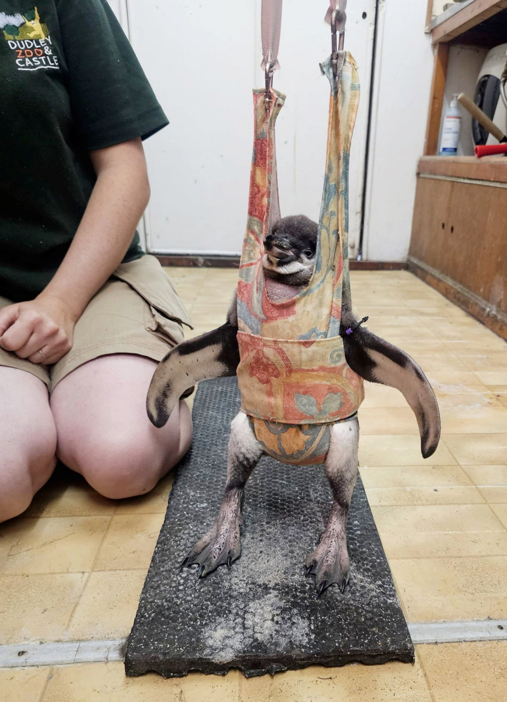 Flop the Humboldt penguin in the baby bouncer on November 28, 2024. A baby penguin which developed a limp has found her waddle again after zookeepers nursed her back to health – using a homemade baby bouncer. Flop the Humboldt penguin was born at Dudley Zoo back in April but her mother passed away shortly after and her dad started to leave the nest for long periods. Zookeepers were forced to step in to hand rear the chick and moved her to a juvenile isolation area but noticed she then began developing a limp. Vets gave her anti-inflammatories and pain relief but less than 24 hours later the animal could no longer support her own weight. Blood tests revealed a reaction to an infection and she was given further medication. Flop started to lose her appetite and became withdrawn, sparking concern among staff that she may not survive. But keepers came with the ingenious idea of a baby bouncer to help keep her upright and also made a tailor-made treadmill by adapting a baby walker for her. (Photo by South West News Service)