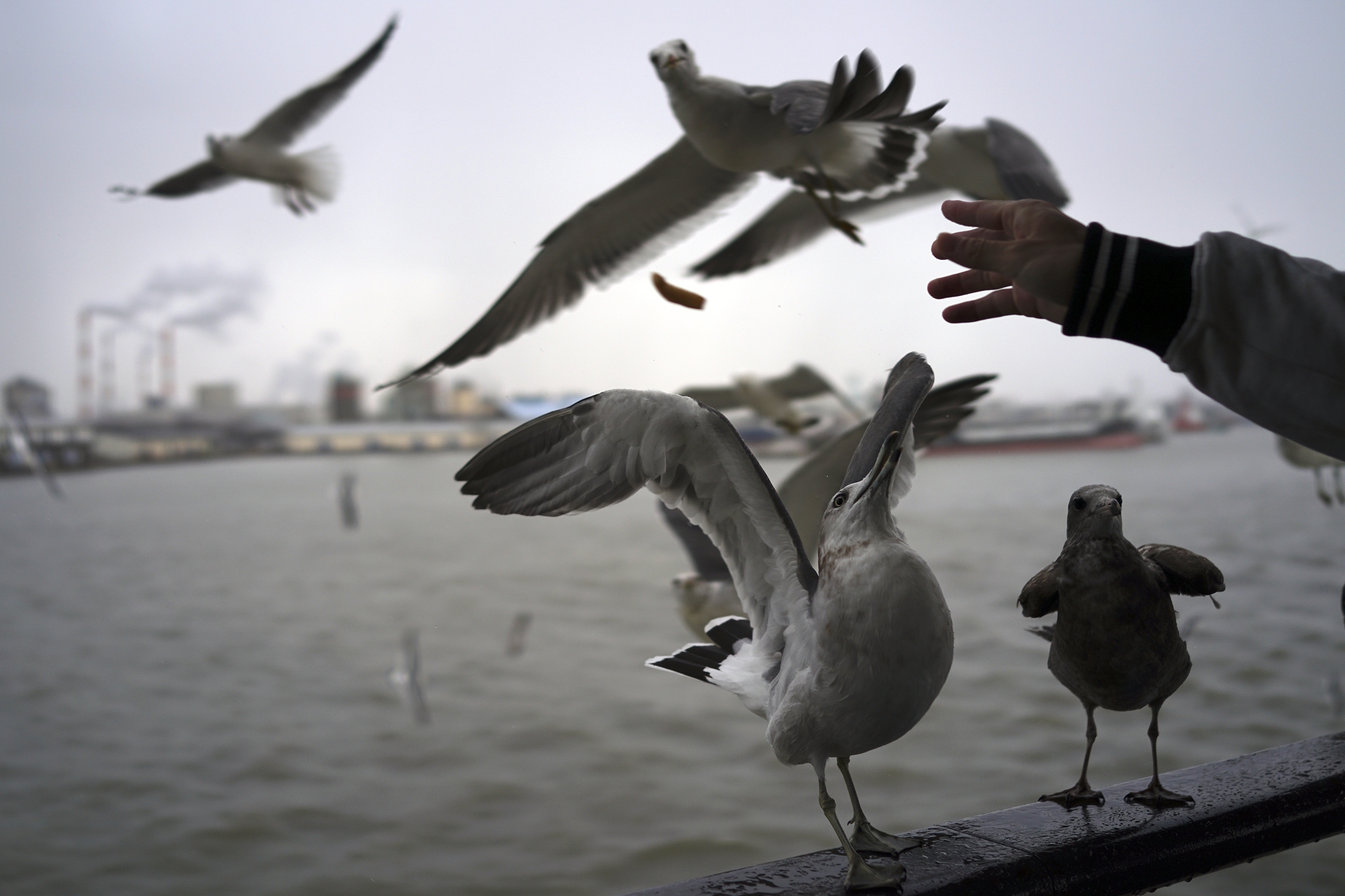 A person feeds seagulls in Niigata, Niigata prefecture, Japan, Saturday, November 23, 2024. (Photo by Eugene Hoshiko/AP Photo)