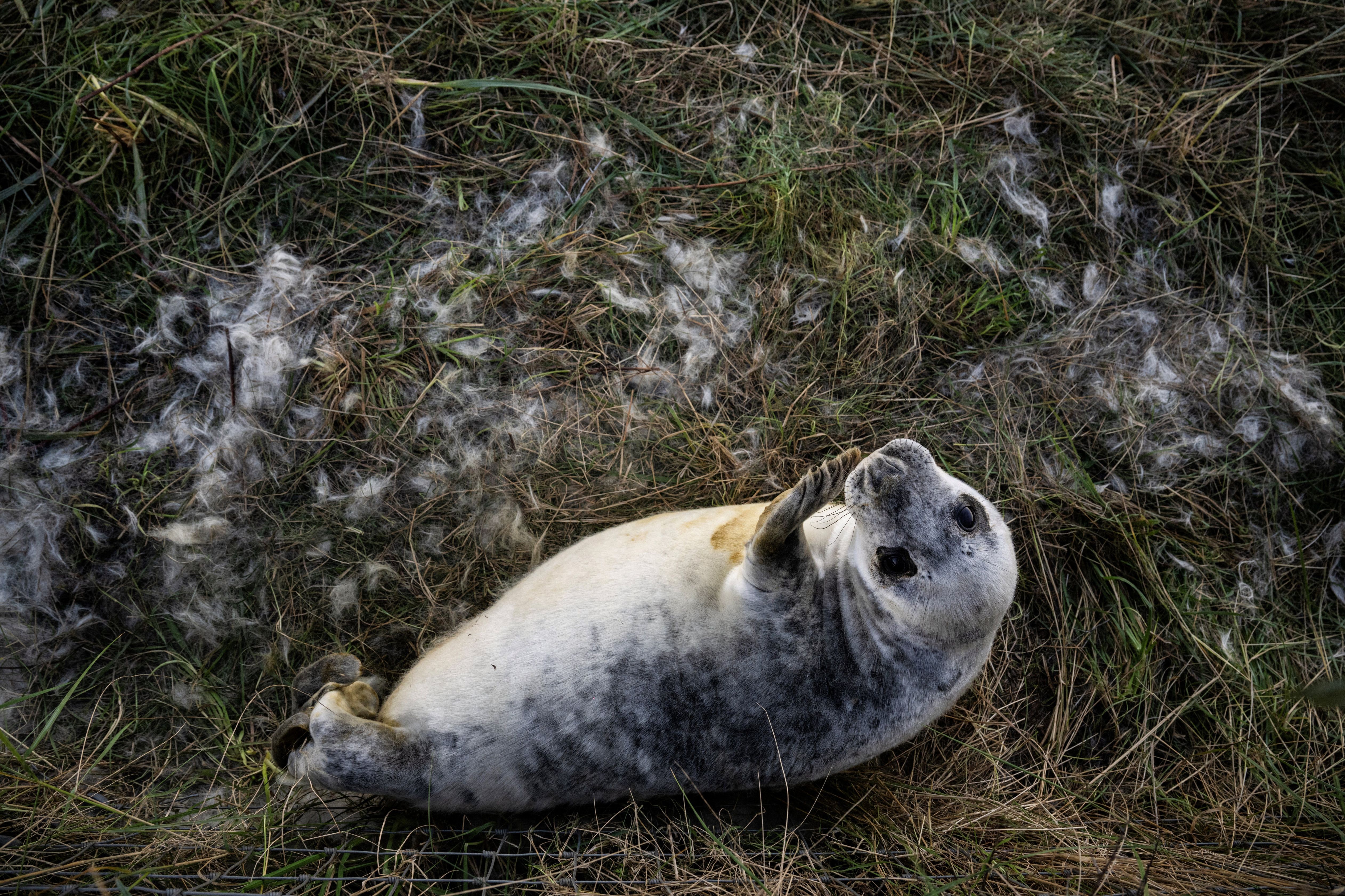 A newly born seal pup reacts while on the sand dunes of the Lincolnshire Wildlife Trust's Donna Nook nature reserve near Grimsby, northeast England, on November 29, 2024. Every month of November and December thousands of grey seals give birth to their pups near the sand dunes of the Donna Nook nature reserve, which is the location for one of the four grey seal colonies on the English east coast. (Photo by Oli Scarff/AFP Photo)