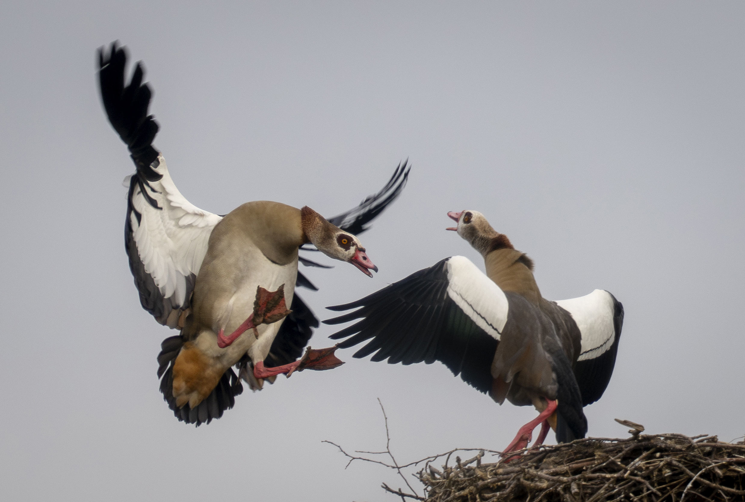 Egyptian geese have occupied a stork nest after the storks migrated south, in Wehrheim near Frankfurt, Germany, Friday, November 29, 2024. (Photo by Michael Probst/AP Photo)