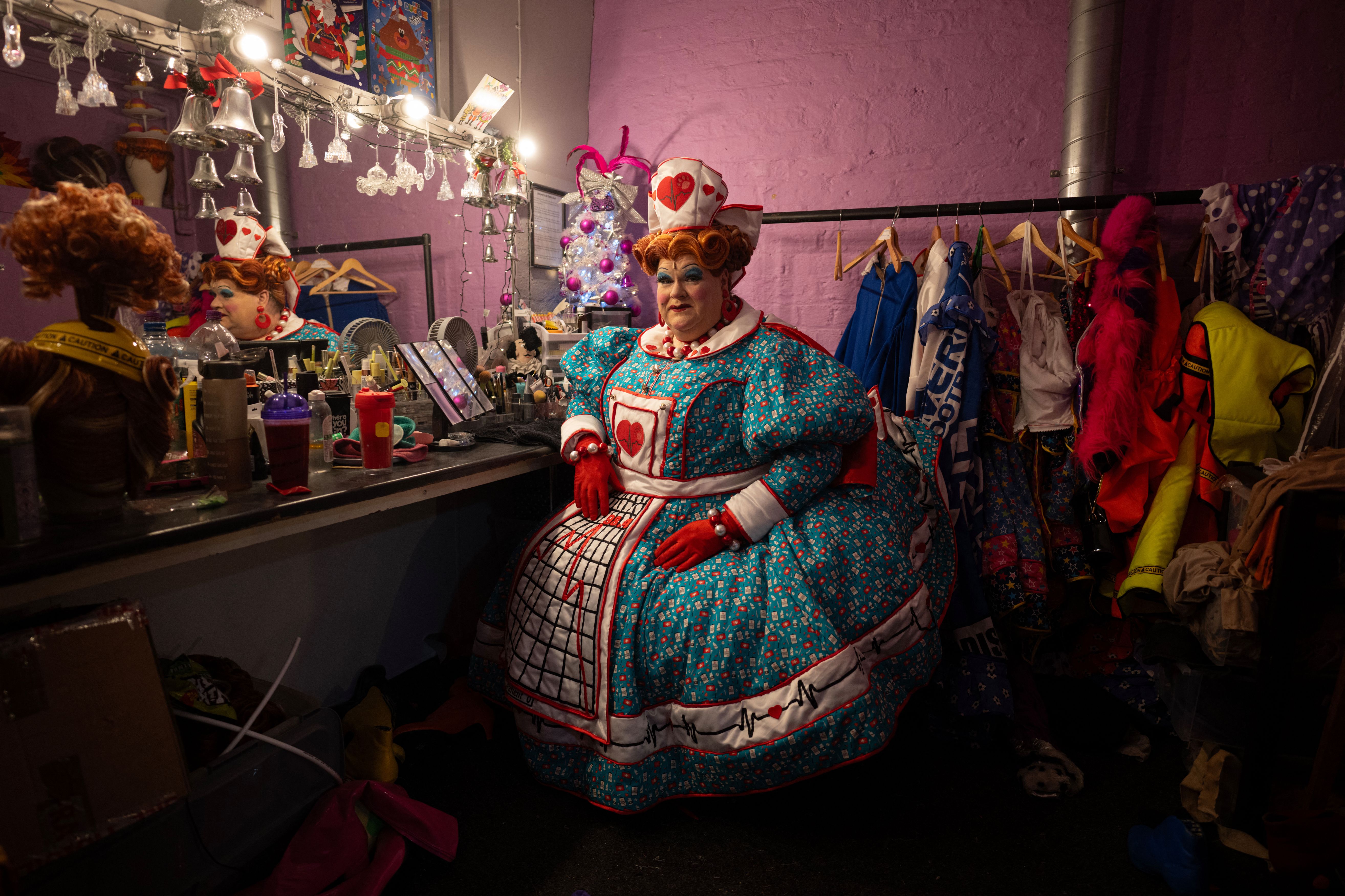 Actor Richard Aucott, playing Nurse Nelly in the Christmas pantomime “Snow White and the Seven Dwarfs”, prepares to perform at St Helens Theatre Royal, in St Helens, north west England, on December 5, 2024. Built by architect Frank Matcham in the 19th Century the Theatre Royal is the principal theatre in St Helens with 700 seats over two tiers. The production of Snow White and the Seven Dwarfs is set to run until January 12, 2025. (Photo by Oli Scarff/AFP Photo)