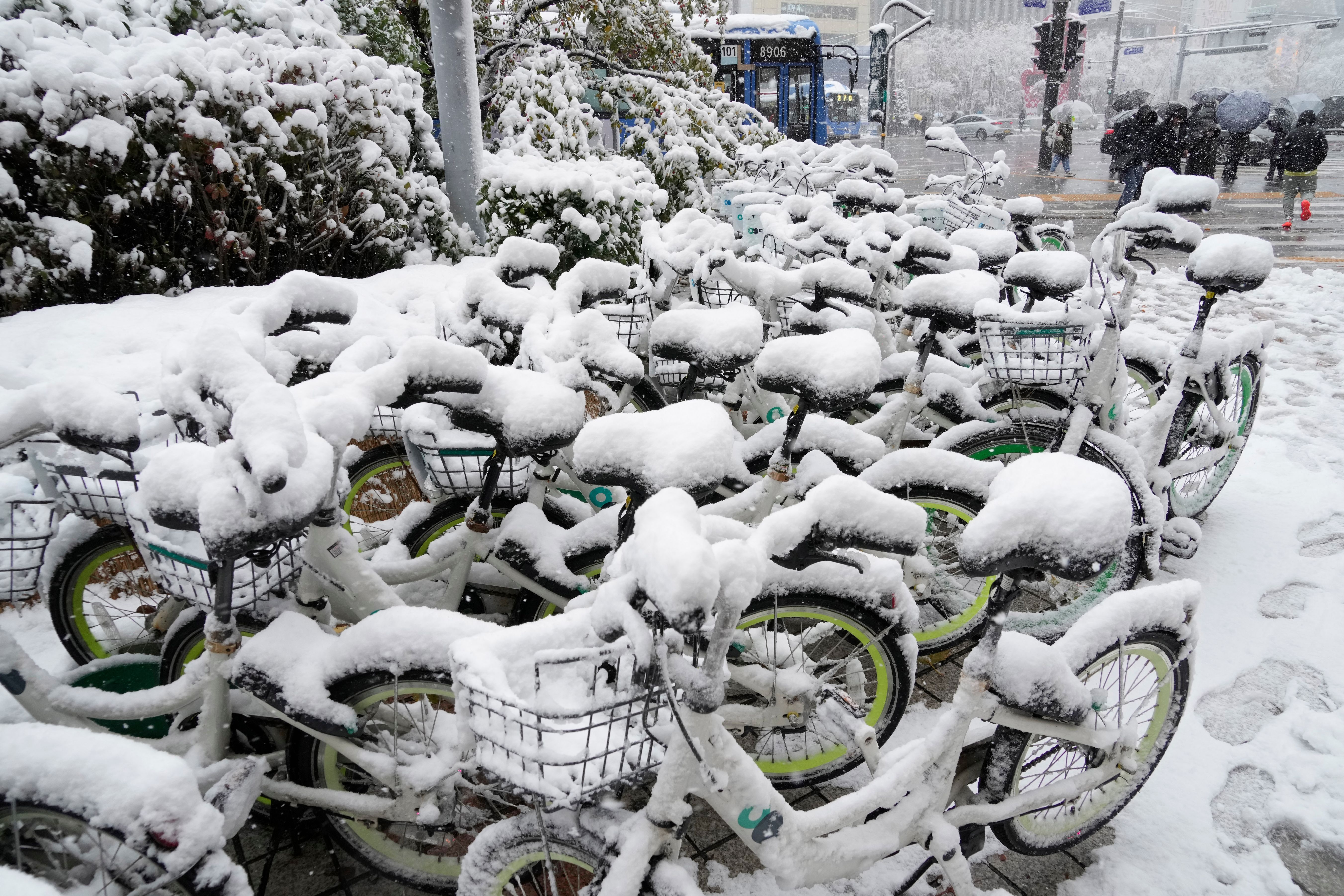 Snow-covered bicycles are parked near a subway station in Seoul, South Korea, Wednesday, November 27, 2024. (Photo by Ahn Young-joon/AP Photo)