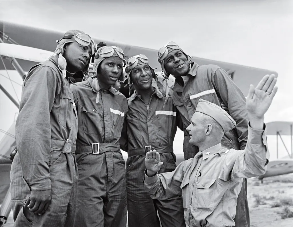 Lt. McCune instructing cadets in training for US Army Air Corps 99th Pursuit Squadron, 1st all-black combat pilot unit (African-Amer. fliers of WWII Tuskegee airmen fame), about air currents at flight school, 1942. (Photo by Gabriel Benzur/Time & Life Pictures)