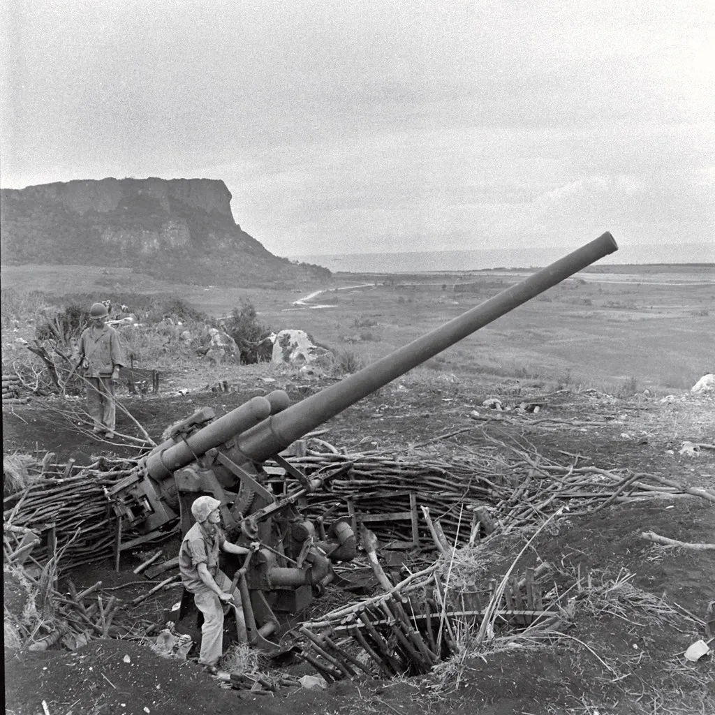 A crew maneuvers an enormous piece of artillery during the Battle of Saipan, 1944. In the waning days of the struggle for the island, thousands of Japanese civilians and troops committed suicide, rather than surrender to American troops. Many leapt to their death from the top of sheer cliffs that fall 200 feet to rocks and surf below. (Photo by Peter Stackpole/Time & Life Pictures)
