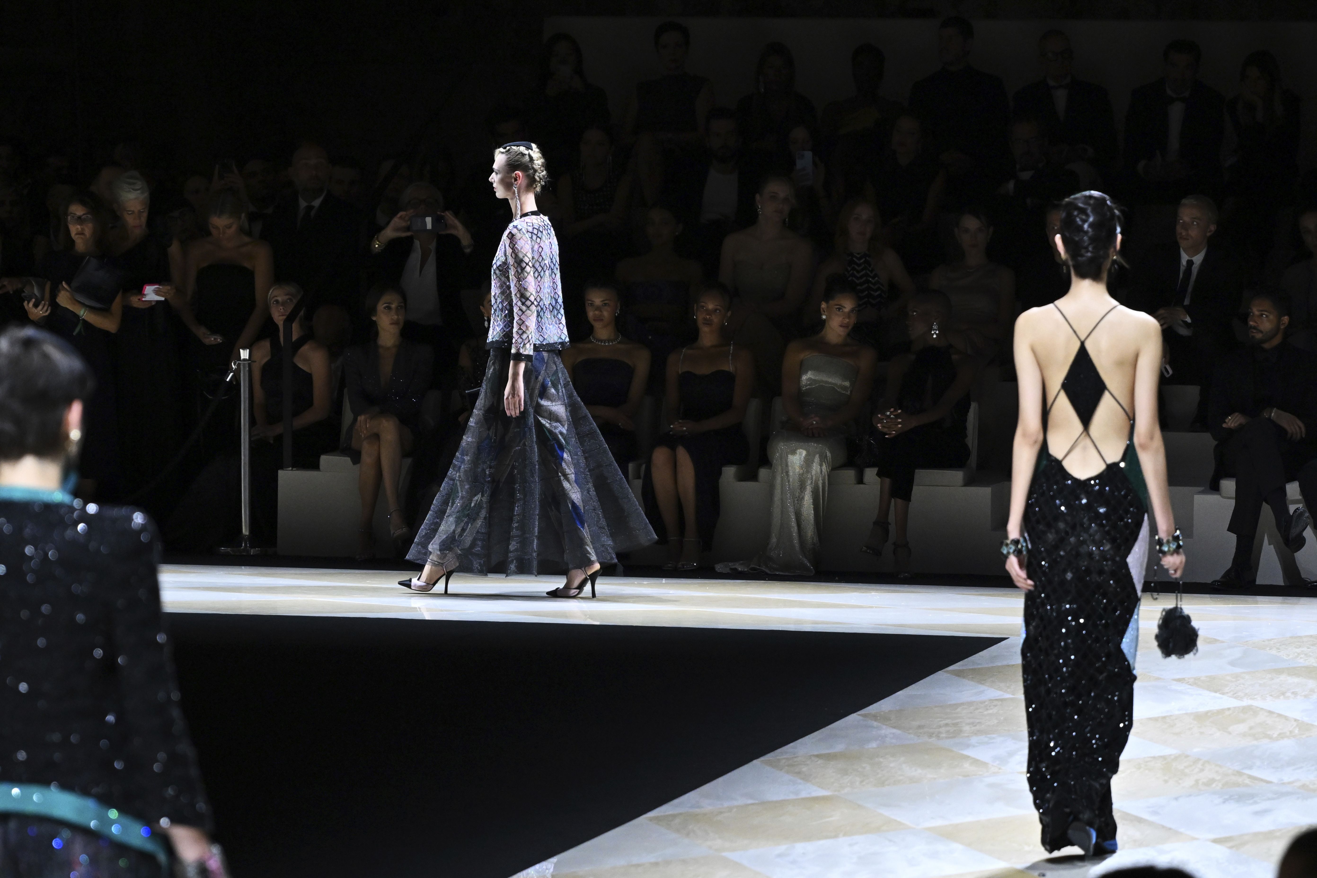 A model for Armani presents a creation during the “One Night Only Venice” fashion show coinciding with the 80th edition of the International Film Festival at the Venice Lido, Saturday, September 2, 2023. The One Night Only series has so far hit London in 2006; Tokyo in 2007; Beijing in 2012; Rome and New York in 2013; Paris in 2014, and Dubai in 2021. (Photo by Gian Mattia D'Alberto/LaPresse via AP Photo)