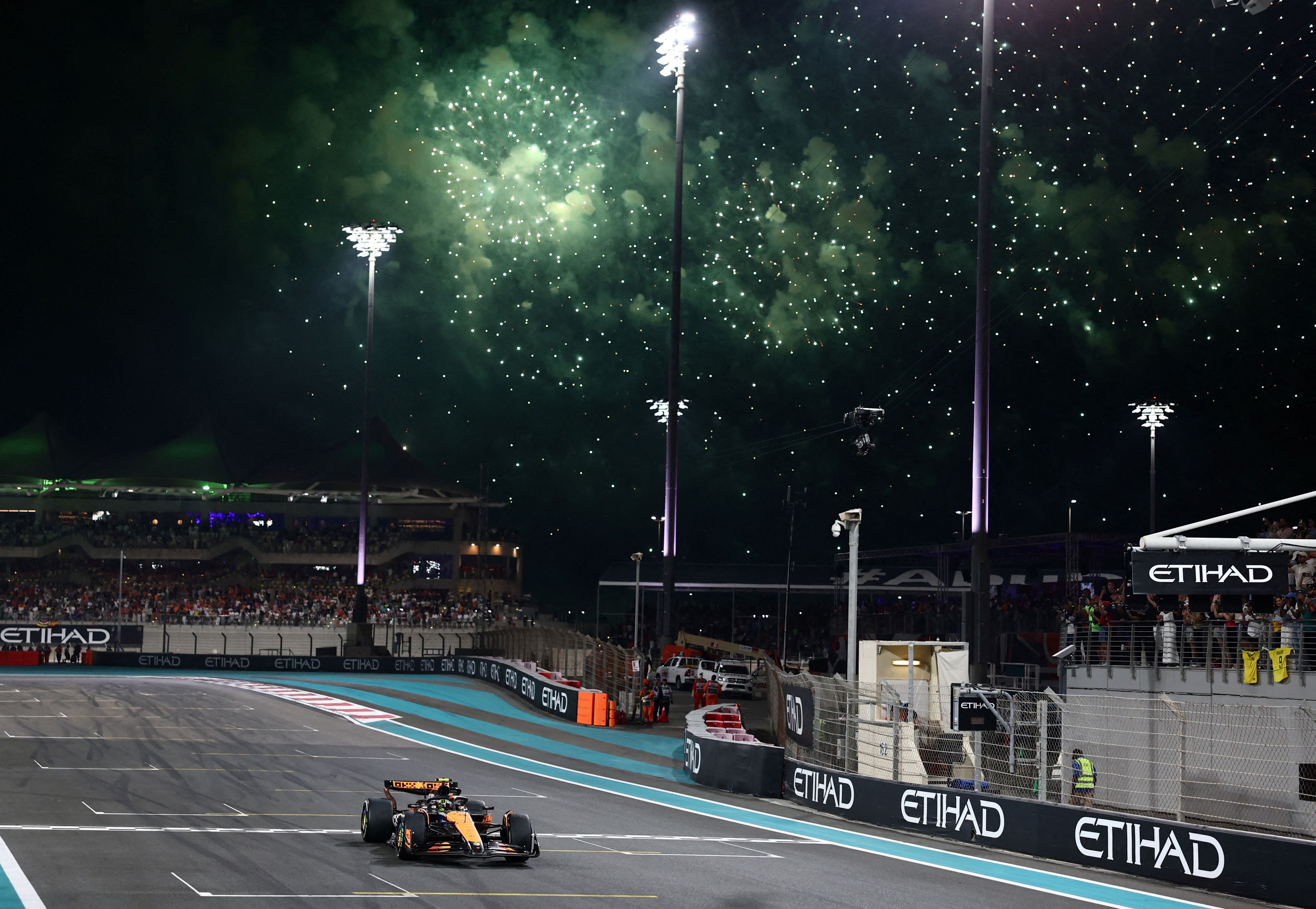 McLaren's British driver Lando Norris crosses the finish line to win the Abu Dhabi Formula One Grand Prix at the Yas Marina Circuit in Abu Dhabi on December 8, 2024. (Photo by Jakub Porzycki/Reuters)