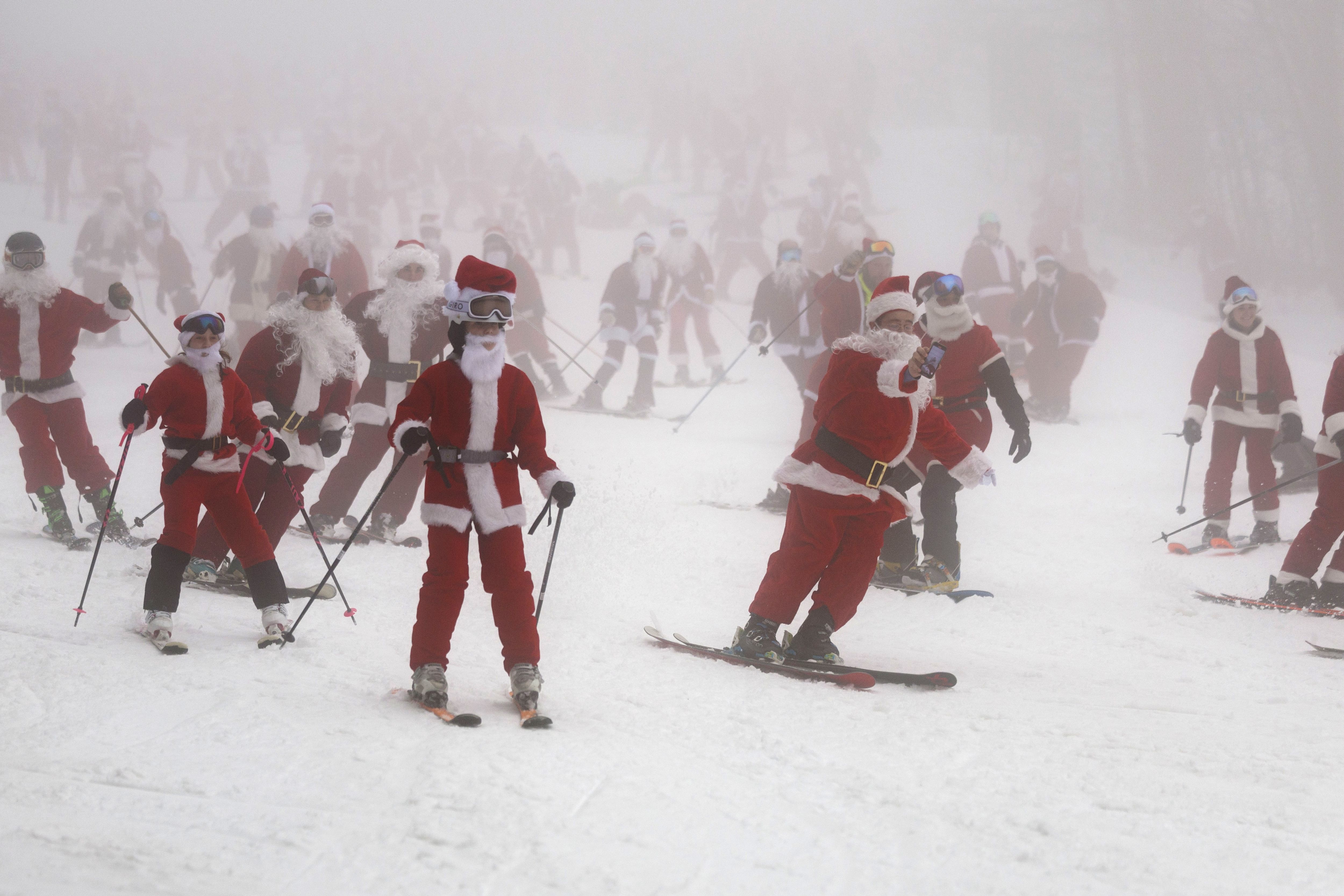 Skiers and snowboarders dressed as Santa Claus, takes part in Sunday Santa ski run at the Sunday River Resort in Newry, Maine, USA, 10 December 2023. More than 300 skiers dressed in Santa themed costumes skied down the mountain to raise money for the “River Fund”, scholarships for students in western Maine. (Photo by CJ Gunther/EPA/EFE)
