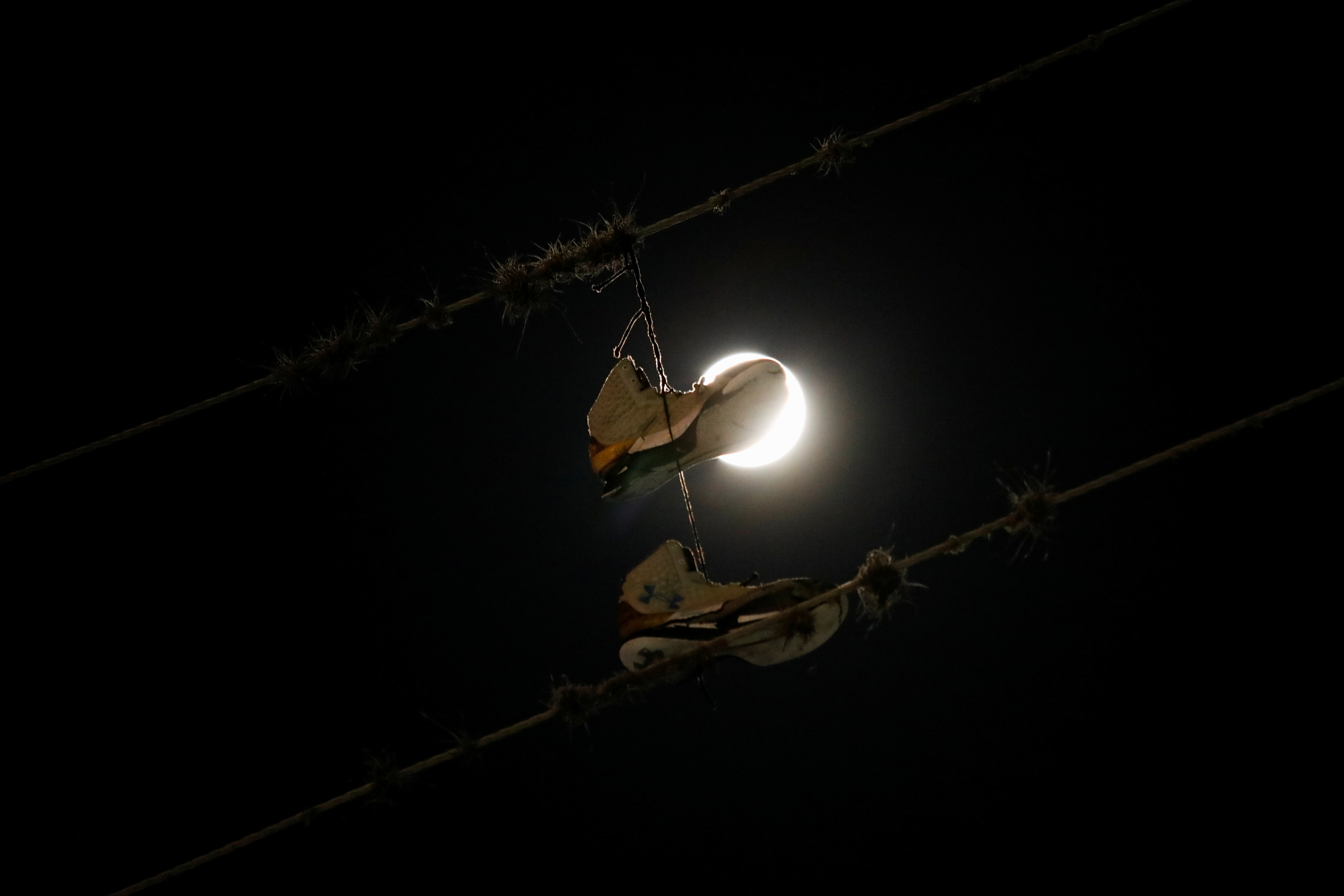 Shoes hang on a power line as the full moon rises before the lunar eclipse in Caracas, Venezuela on September 17, 2024. (Photo by Leonardo Fernandez Viloria/Reuters)