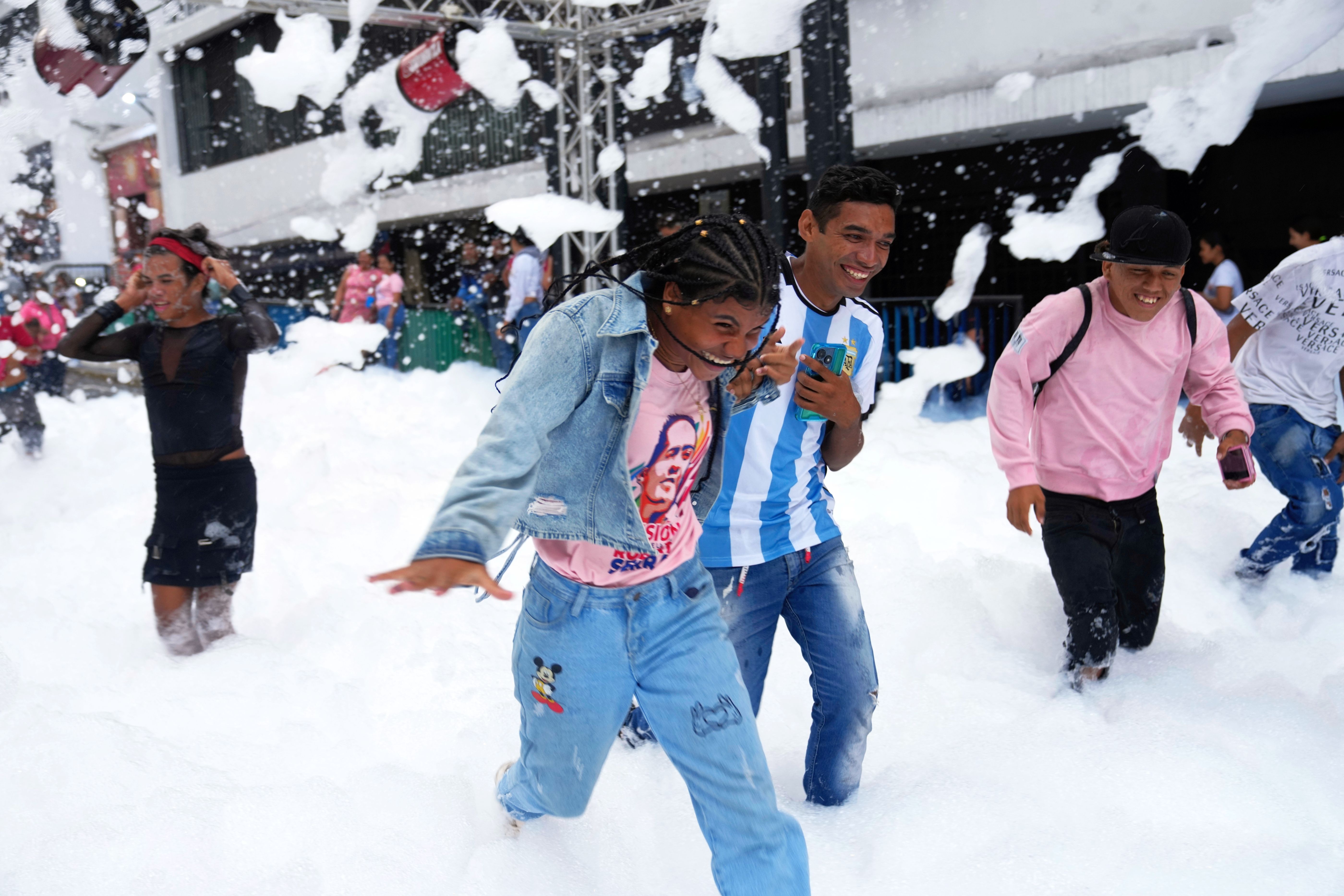 Youth run through foam during an event celebrating University Student Day in Caracas, Venezuela, Thursday, November 21, 2024. (Photo by Ariana Cubillos/AP Photo)