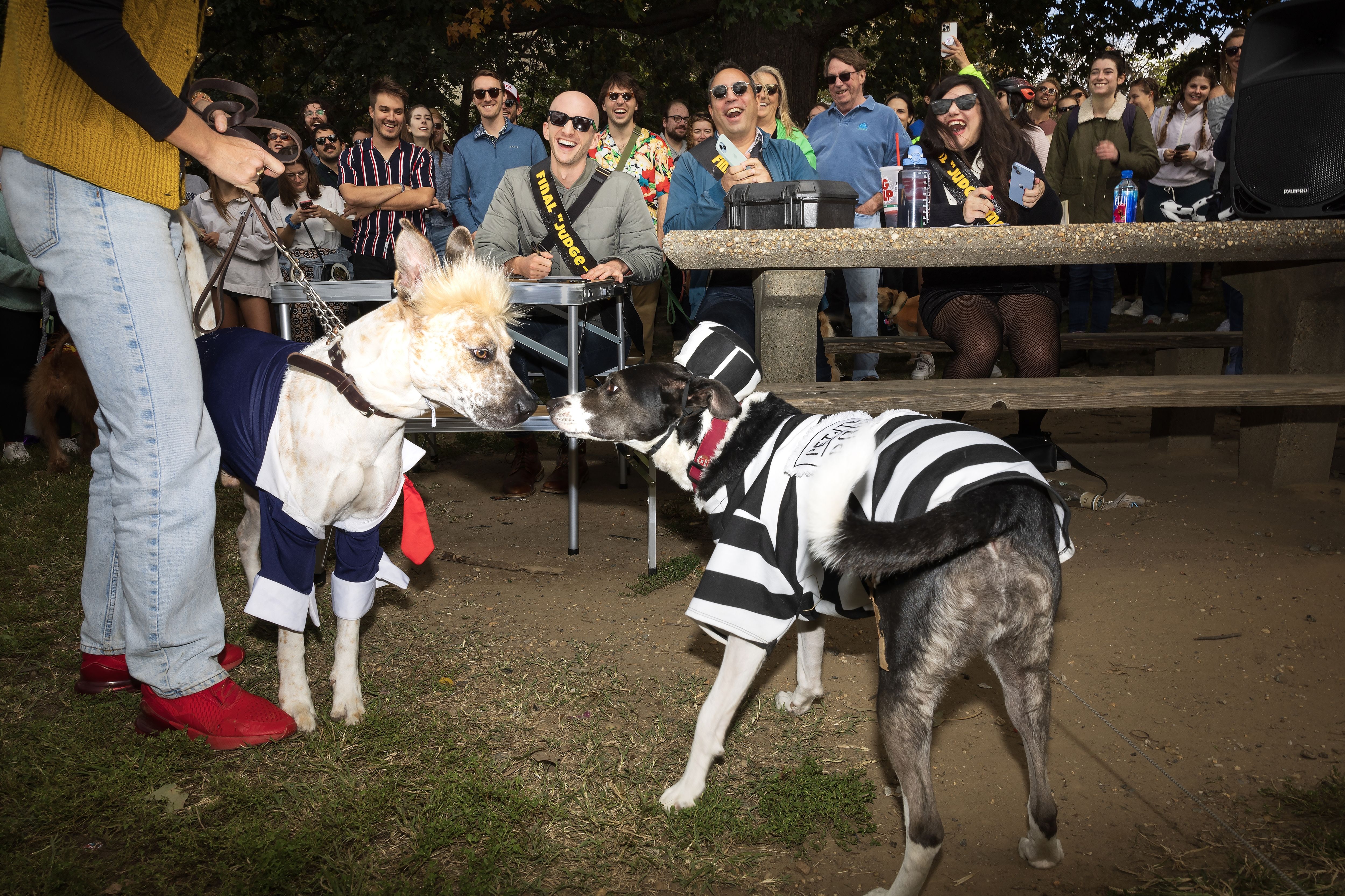 Judges react as Butters, dressed as former President Donald Trump, greets a fellow competitor dressed as an inmate, during the First Annual Kalorama Park Halloween Dog Parade on Saturday, October 21, 2023 in Kalorama Park near the Adams Morgan neighborhood of Washington. Over 100 people were in attendance. (Photo by Tom Brenner for The Washington Post)
