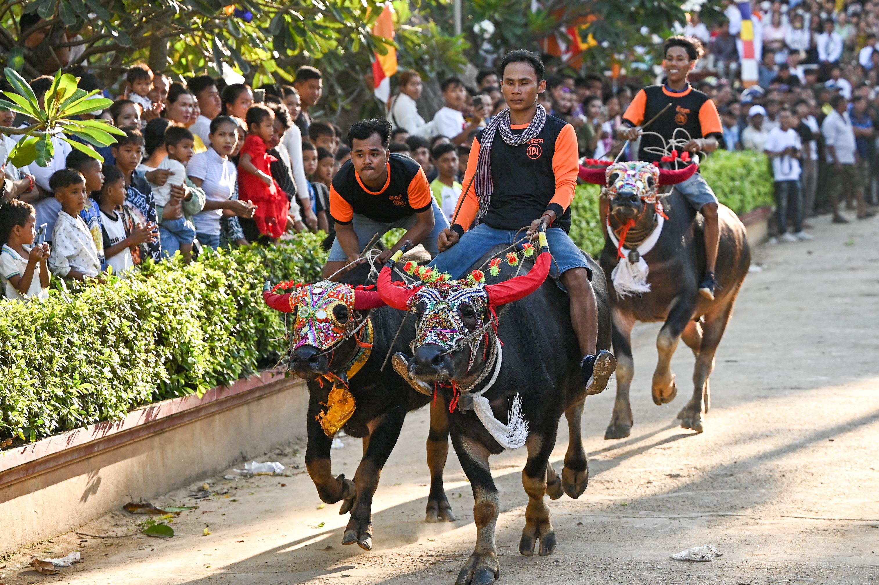 Cambodian villagers race buffaloes during the Pchum Ben festival, the festival of death, outside the pagoda in Vihear Suor village, in Kandal province on October 14, 2023. (Photo by Tang Chhin Sothy/AFP Photo)