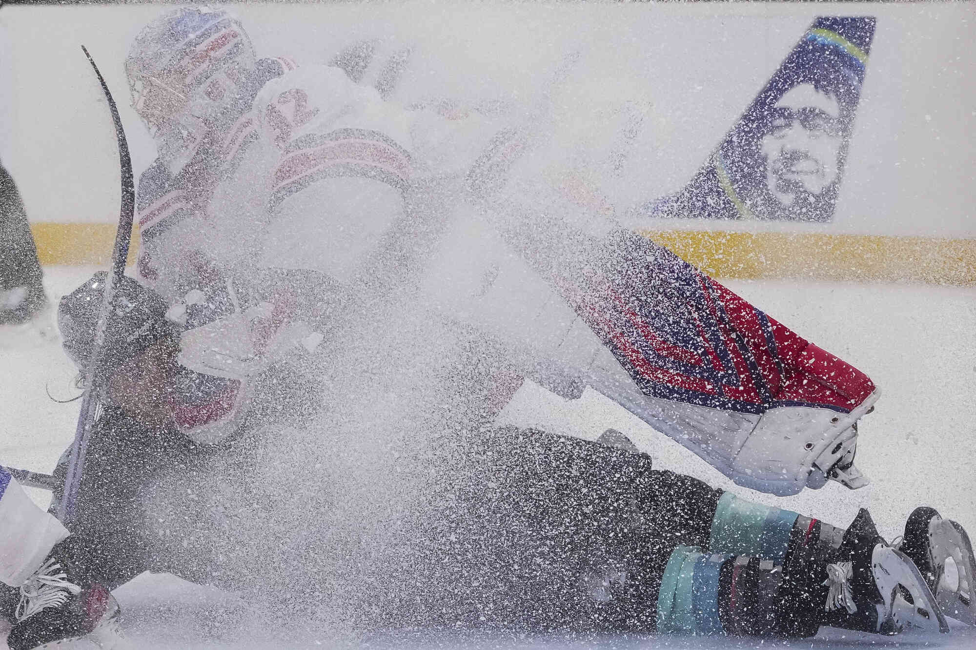 Seattle Kraken left wing Brandon Tanev collides with New York Rangers goaltender Jonathan Quick (32) after losing the puck during the second period of an NHL hockey game Sunday, November 17, 2024, in Seattle. (Photo by Lindsey Wasson/AP Photo)