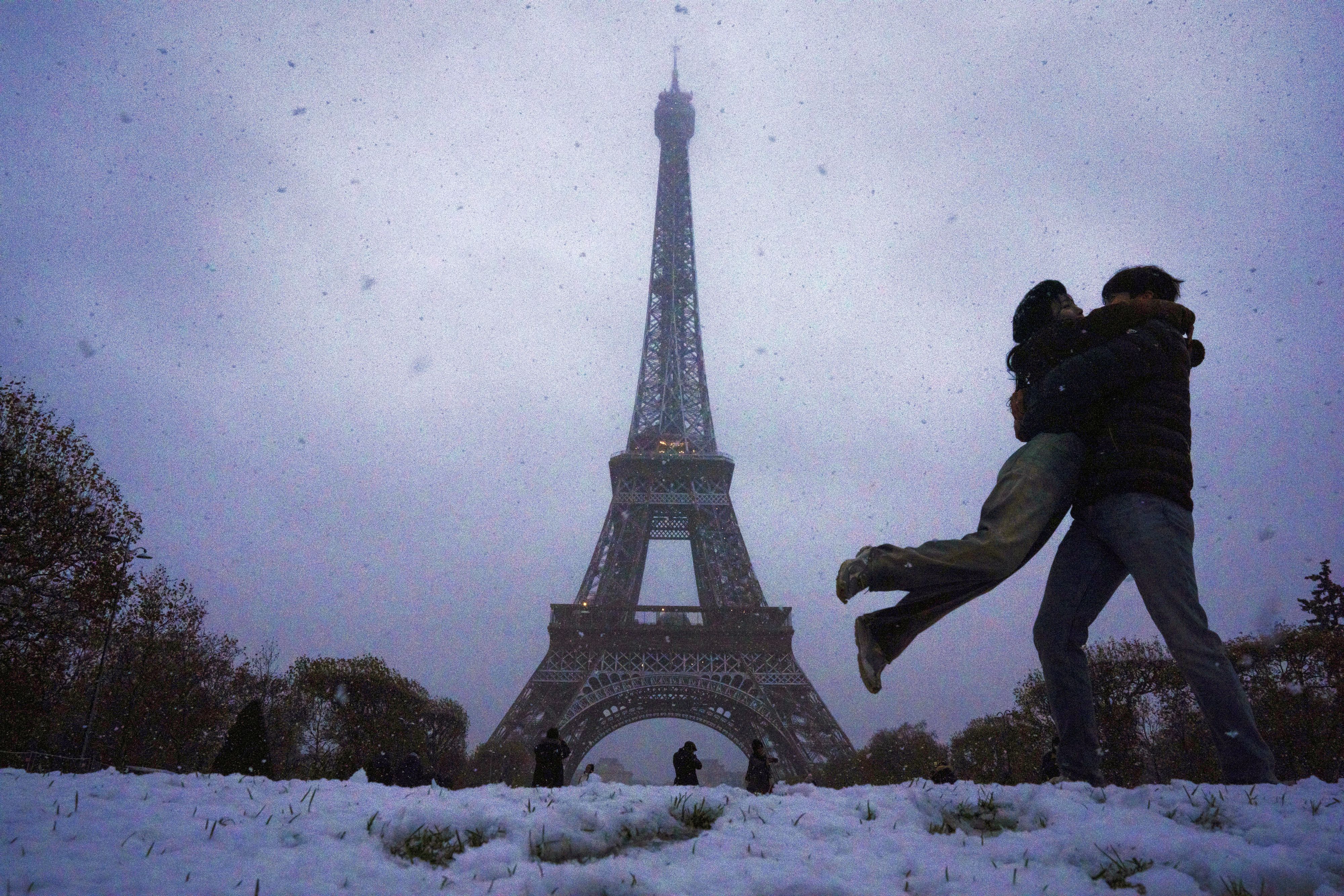 Visitors move as snow falls, with the Eiffel Tower in the background, in Paris, Thursday, November 21, 2024. (Photo by Louise Delmotte/AP Photo)