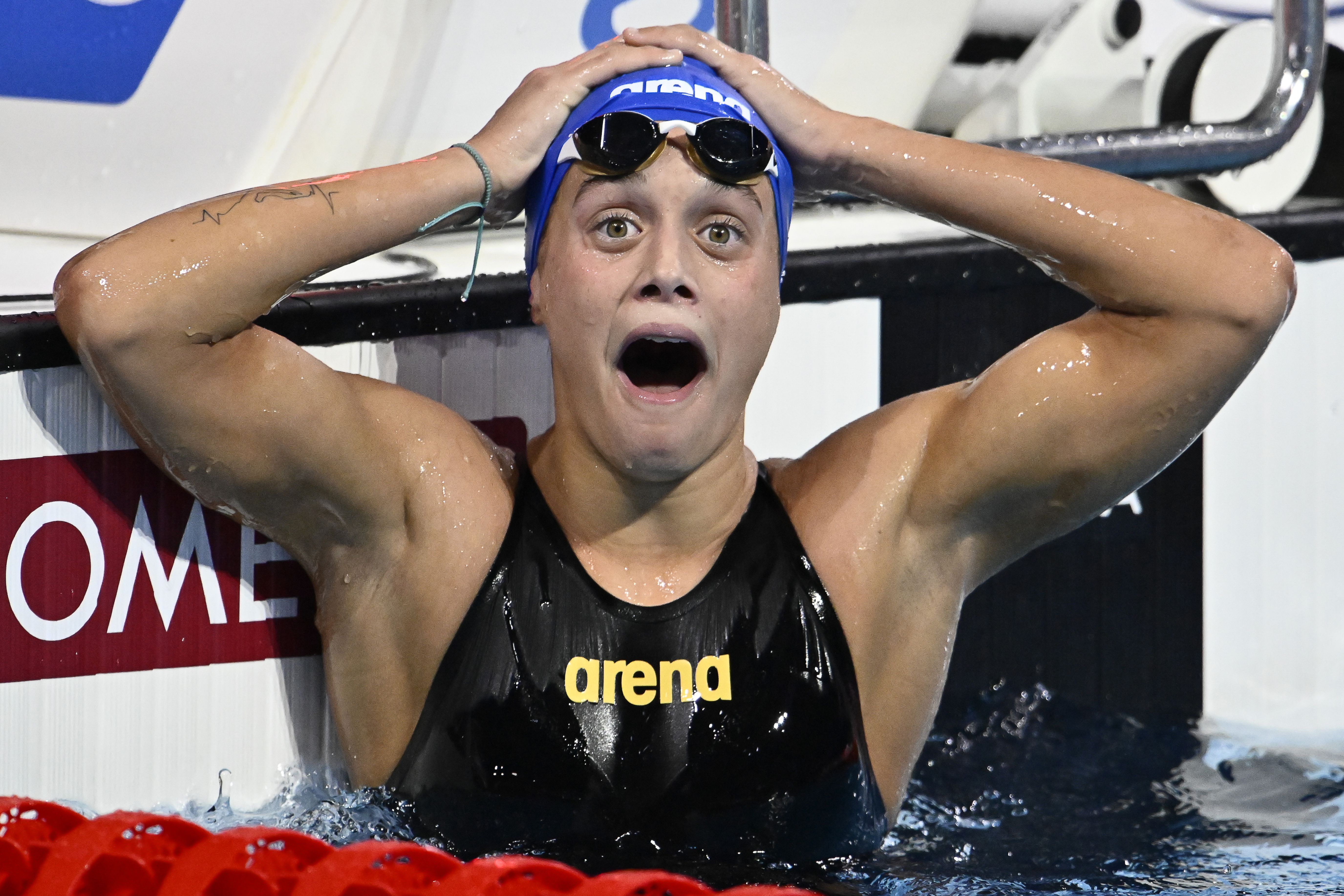 Artemis Vasilaki of Greece reacts after competing in the Women's 1500m Freestyle Heats on day four of the World Short Course Swimming Championships in Budapest, Hungary, Friday, December 13, 2024. (Photo by Denes Erdos/AP Photo)