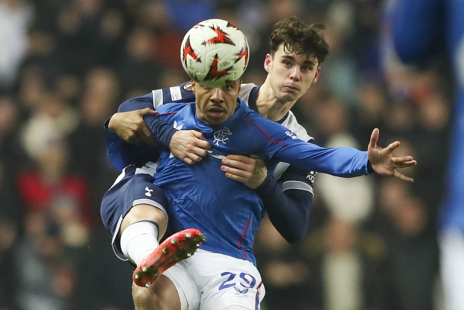 Tottenham's Archie Gray, rear, challenges Rangers' Hamza Igamane during the Europa League opening phase soccer match between Glasgow Rangers and Tottenham Hotspur at Ibrox stadium in Glasgow, Thursday, December 12, 2024. (Photo by Scott Heppell/AP Photo)