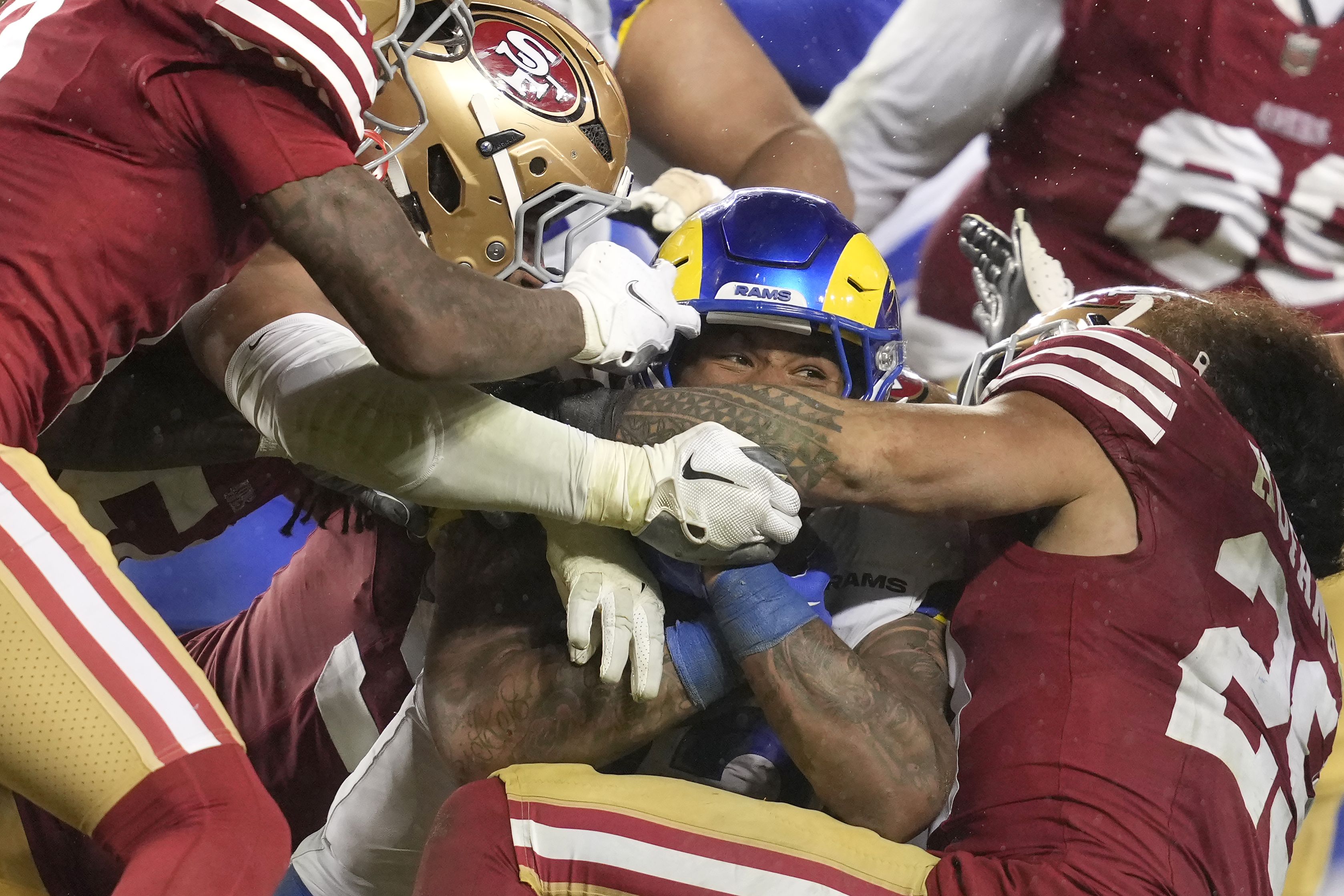 Los Angeles Rams running back Kyren Williams, middle, is tackled against the San Francisco 49ers during the second half of an NFL football game in Santa Clara, Calif., Thursday, December 12, 2024. (Photo by Godofredo A. Vásquez/AP Photo)