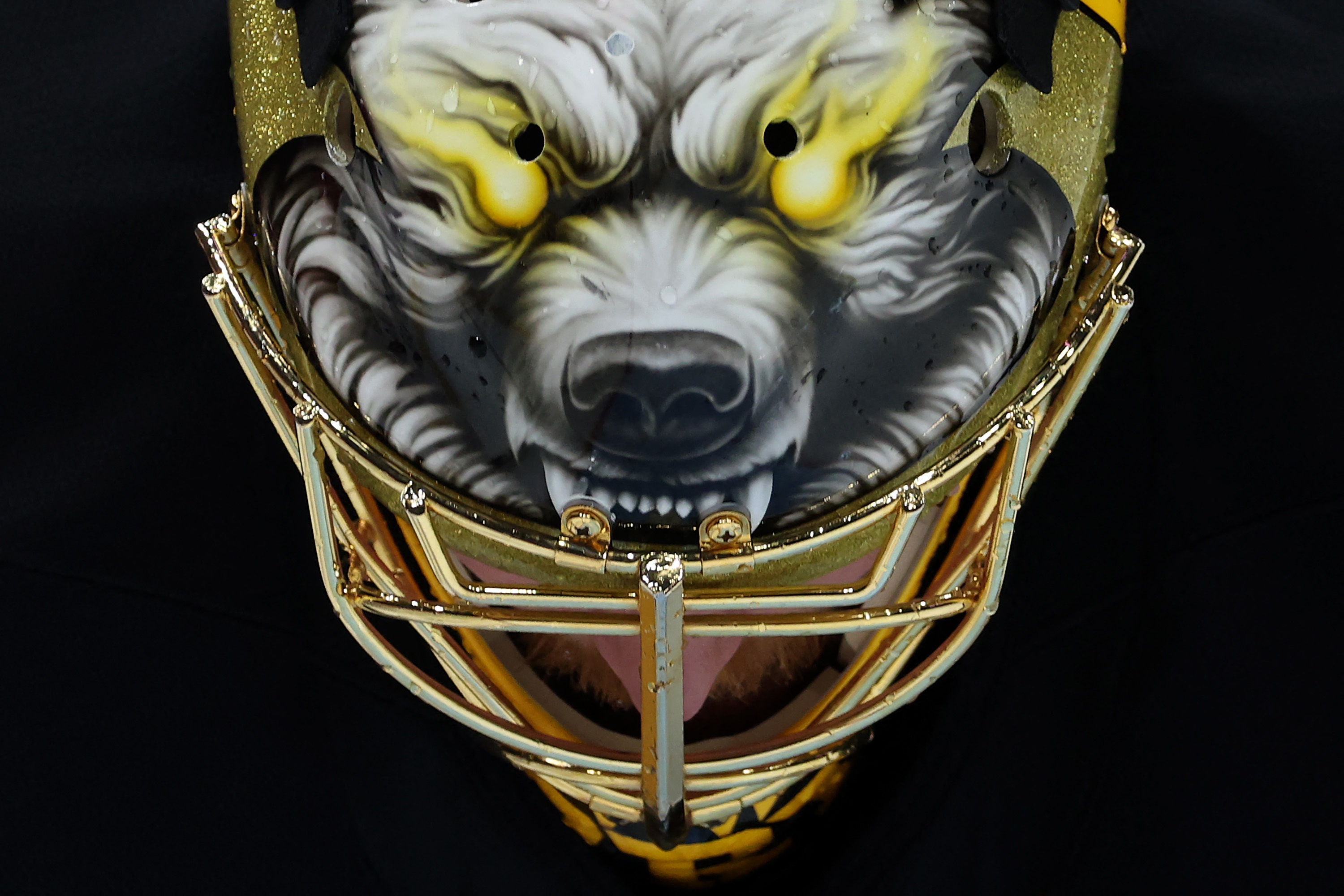 Details of the goaltender mask are seen on Joonas Korpisalo #70 of the Boston Bruins during the second period against the Seattle Kraken at Climate Pledge Arena on December 12, 2024 in Seattle, Washington. (Photo by Steph Chambers/Getty Images/AFP Photo)