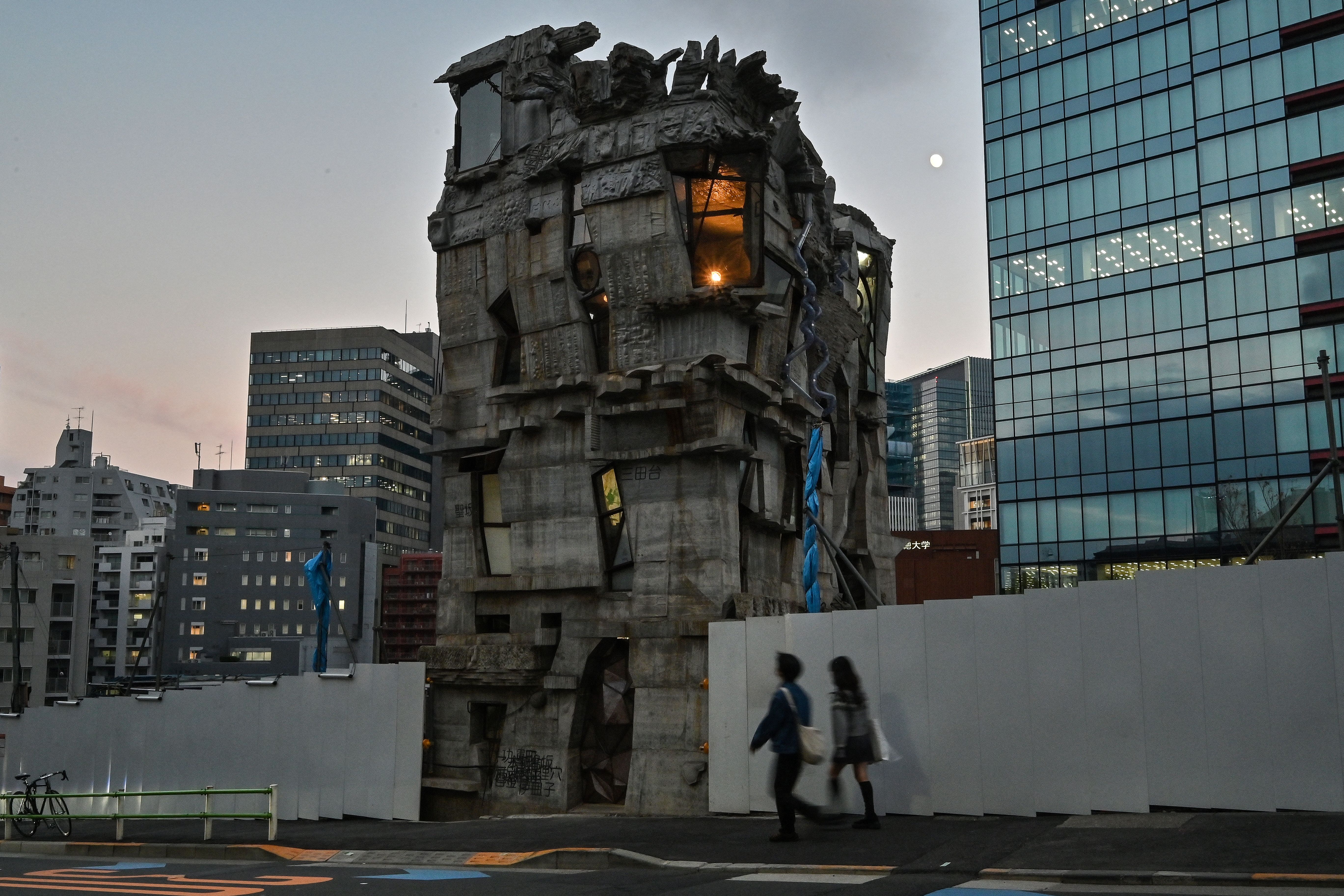 This photo taken on November 13, 2024 shows pedestrians walking past the four-storey Arimaston Building by Japanese architect Keisuke Oka in the Mita area of Minato Ward in Tokyo. Passers-by stop and stare at the ramshackle, hand-built concrete tower that looks like it has been lifted right out of a Japanese animation and dropped onto a real-life Tokyo street. Oka started construction in 2005. Apart from the help of a few friends, he made the entire building himself by hand. (Photo by Richard A. Brooks/AFP Photo)