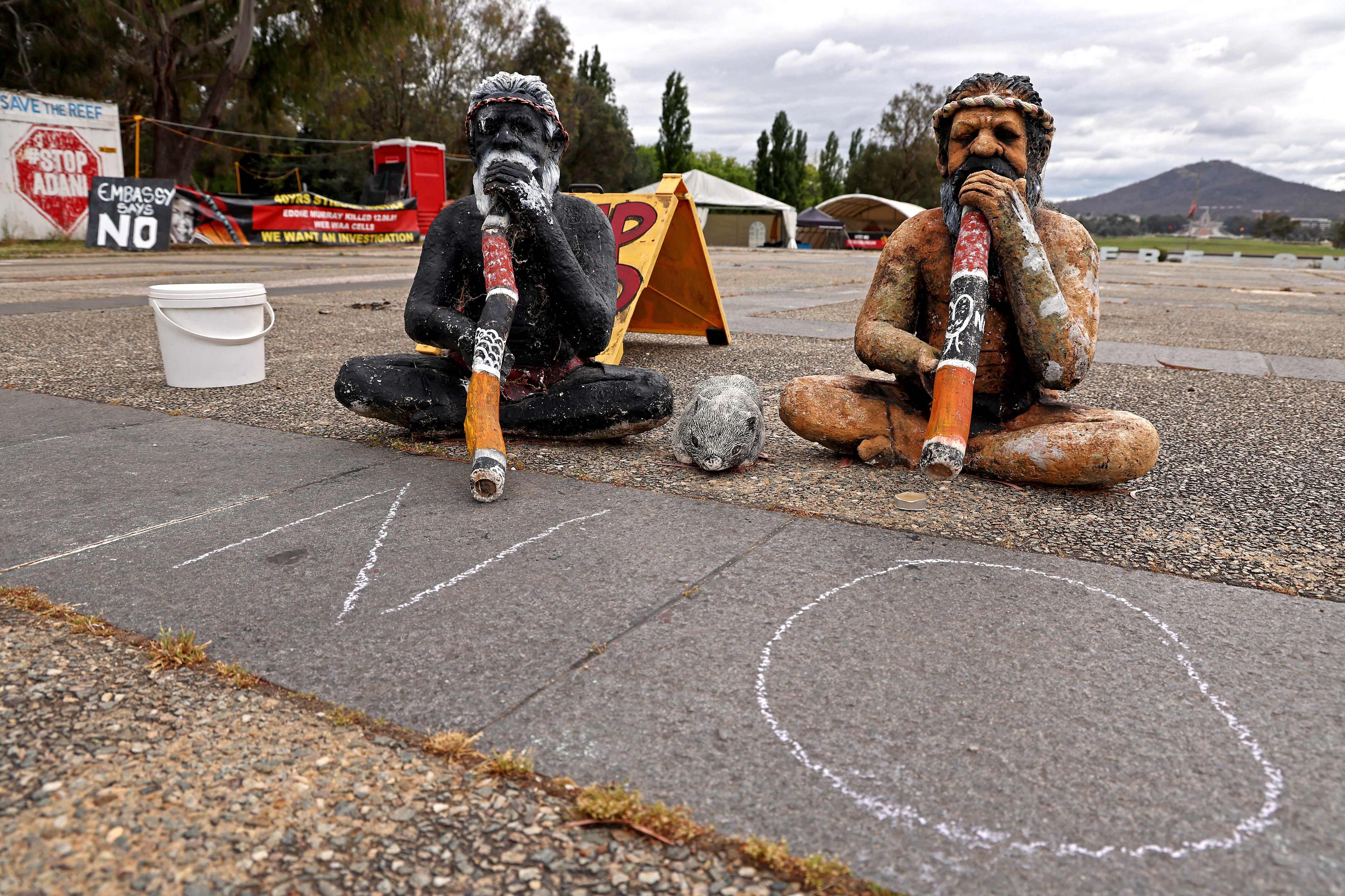 Two statues of Indigenous Australians with didgeridoos sit in front of the Aboriginal Tent Embassy located outside the old Parliament House in Canberra on October 15, 2023. (Photo by David Gray/AFP Photo)