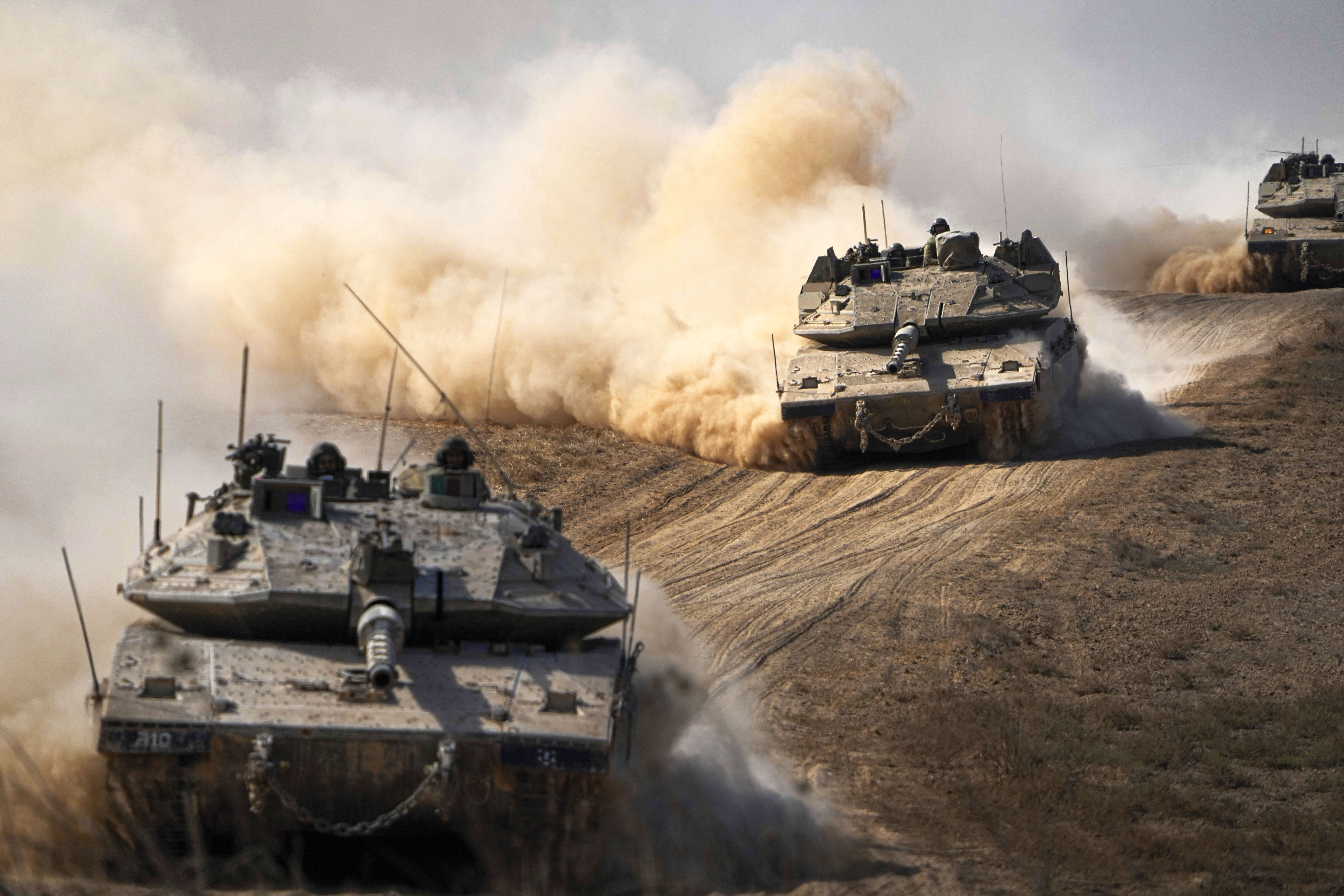Israeli tanks head towards the Gaza Strip border in southern Israel on Friday, October 13, 2023. (Photo by Ariel Schalit/AP Photo)