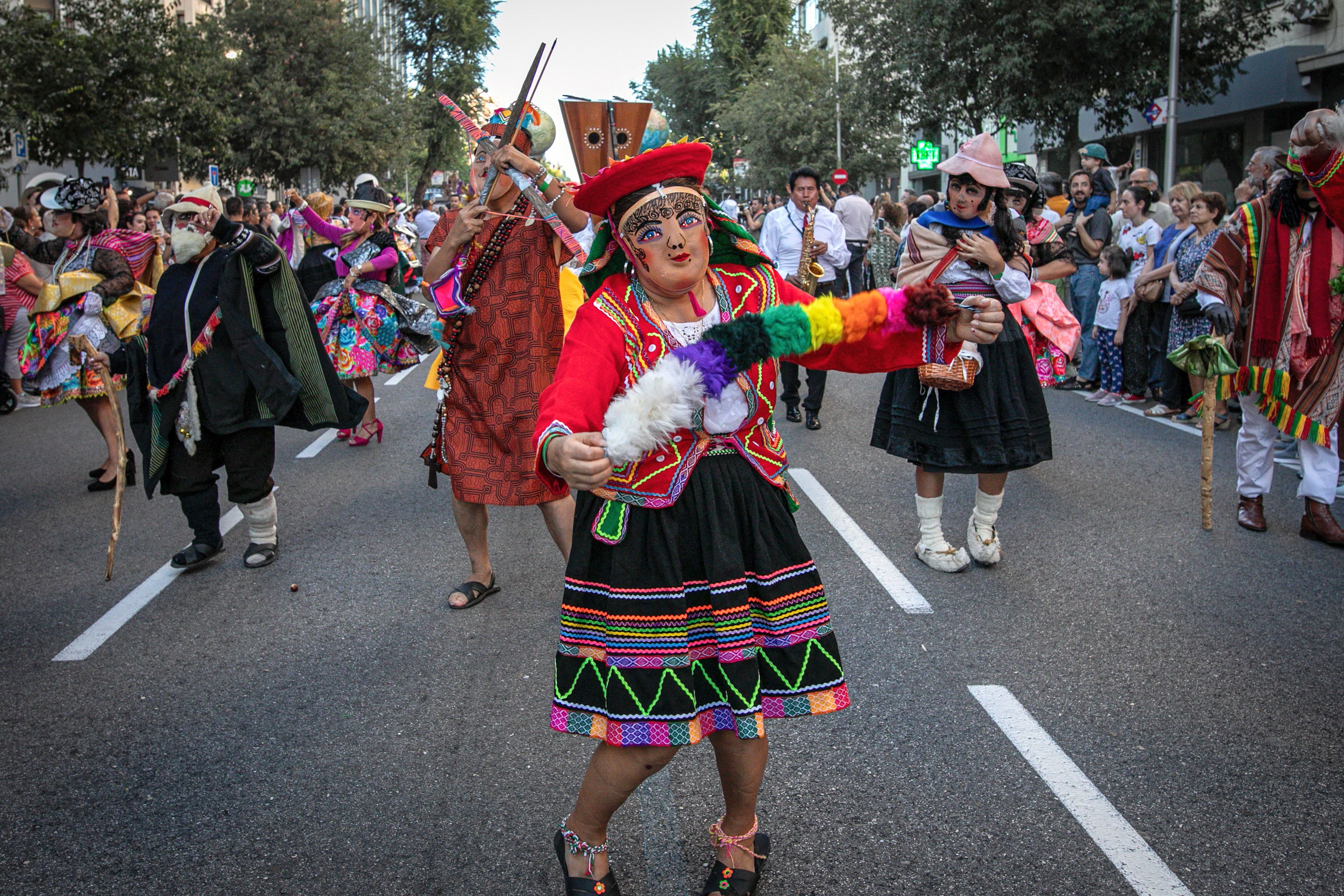 Artists representing the Bolivian delegation dance during the carnival to celebrate Hispanicity in Madrid, Spain on October 7, 2023. A festive parade took place along Bravo Murillo Street on the occasion of the Hispanic festivities for the discovery of America. The party has been organized by the city council of the capital with the cooperation of the different representations of the Latin American countrie. (Photo by David Canales/SOPA Images/Rex Features/Shutterstock)