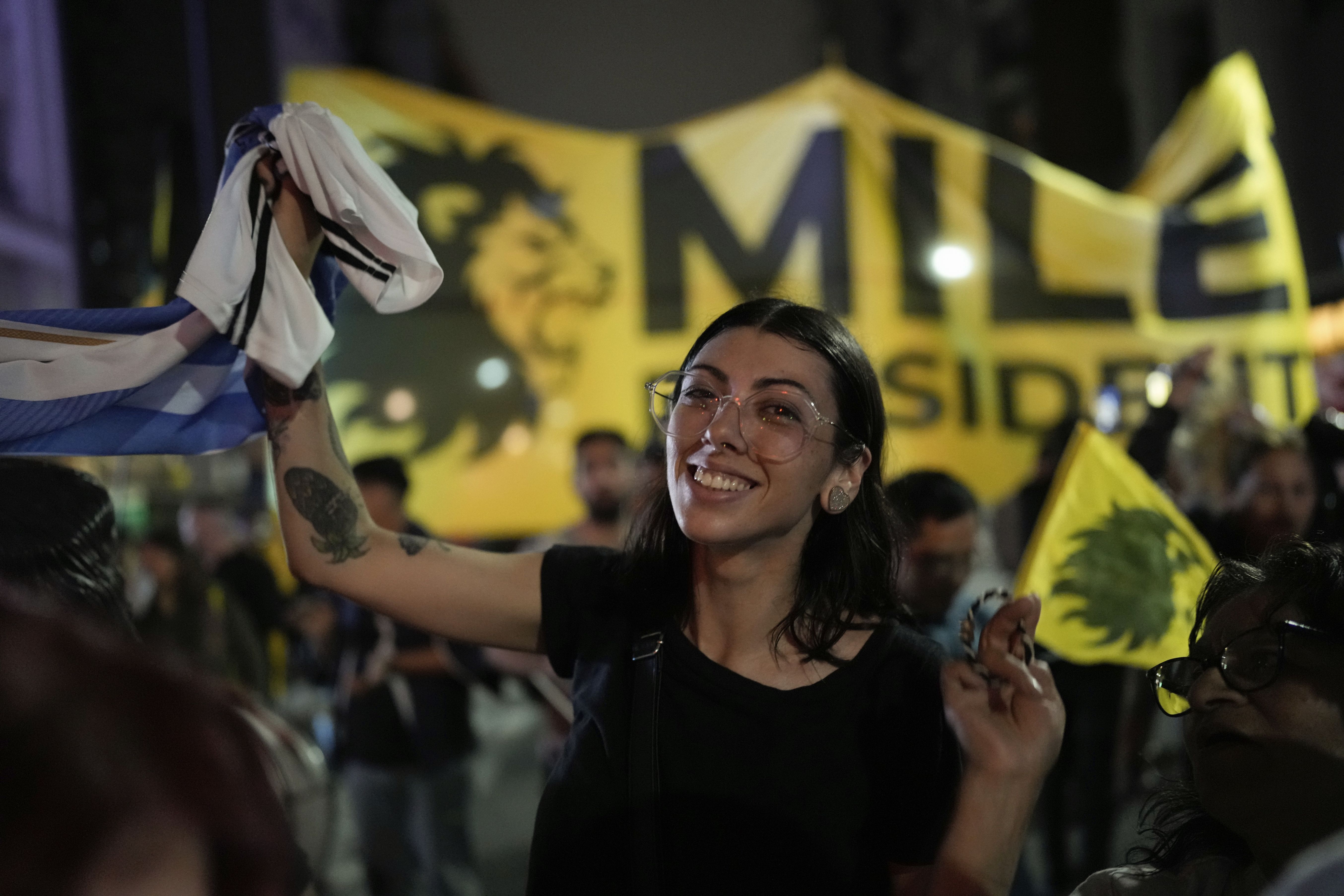 Supporters of Javier Milei, presidential candidate of the Liberty Advances coalition, gather outside his campaign headquarters after polls closed for general elections in Buenos Aires, Argentina, Sunday, October 22, 2023. (Photo by Rodrigo Abd/AP Photo)