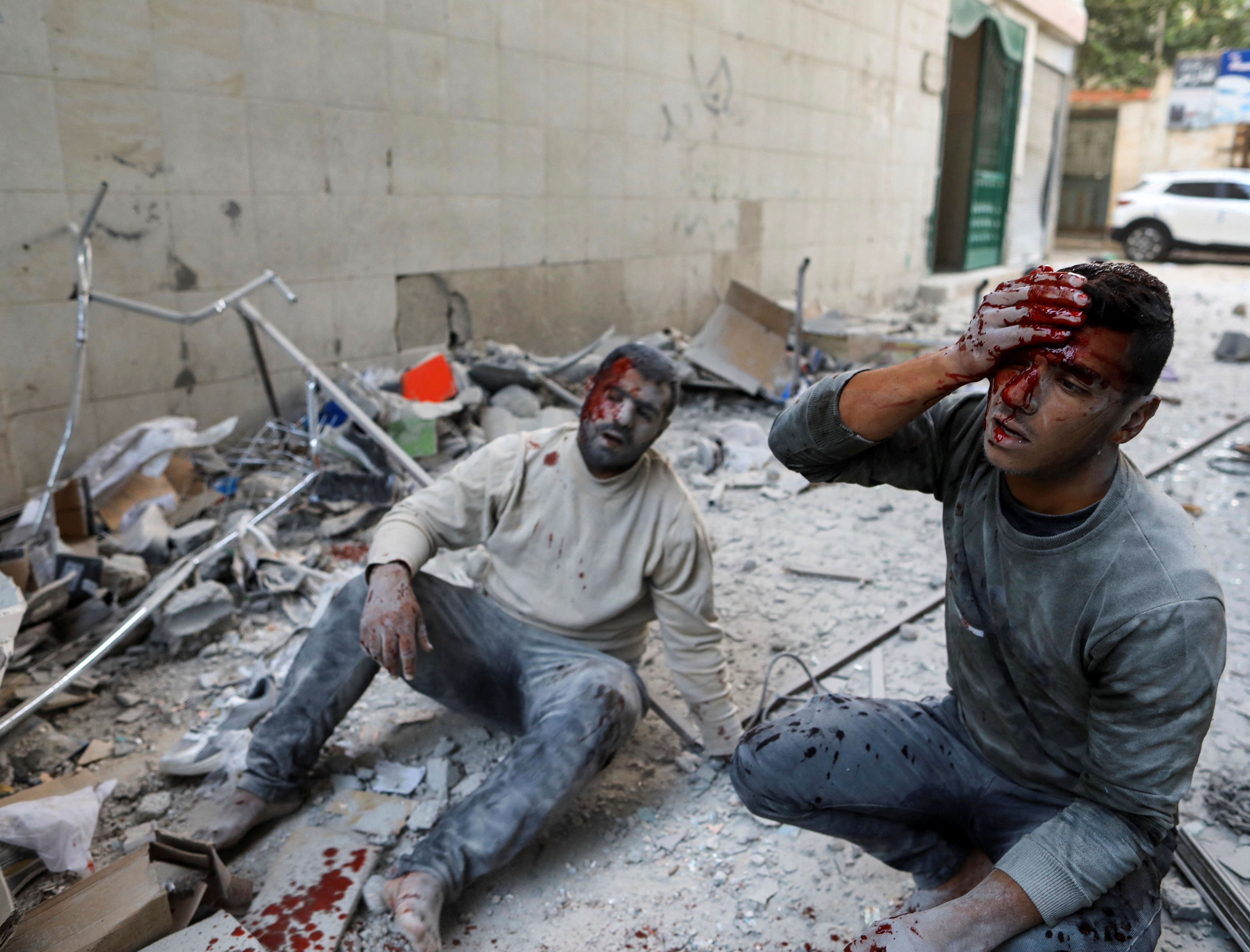 Wounded Palestinians react at the site of an Israeli strike in Khan Younis in the southern Gaza Strip on October 19, 2023. (Photo by Yasser Qudih/Reuters)