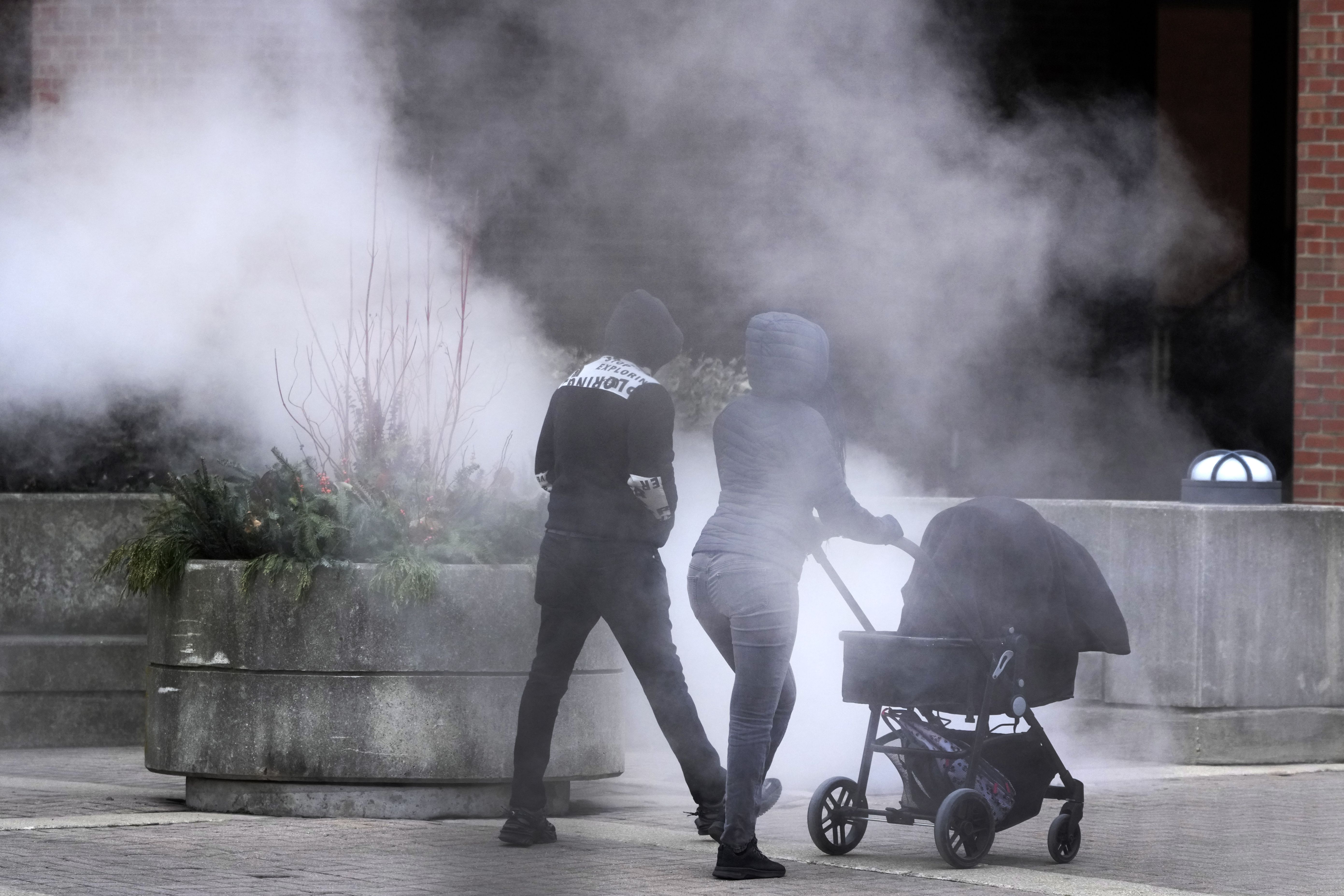 A couple push a baby carriage past steam released in the air as an Arctic blast brings single-digit temperatures with wind chills below zero on Thursday, December 12, 2024, in Chicago. (Photo by Charles Rex Arbogast/AP Photo)