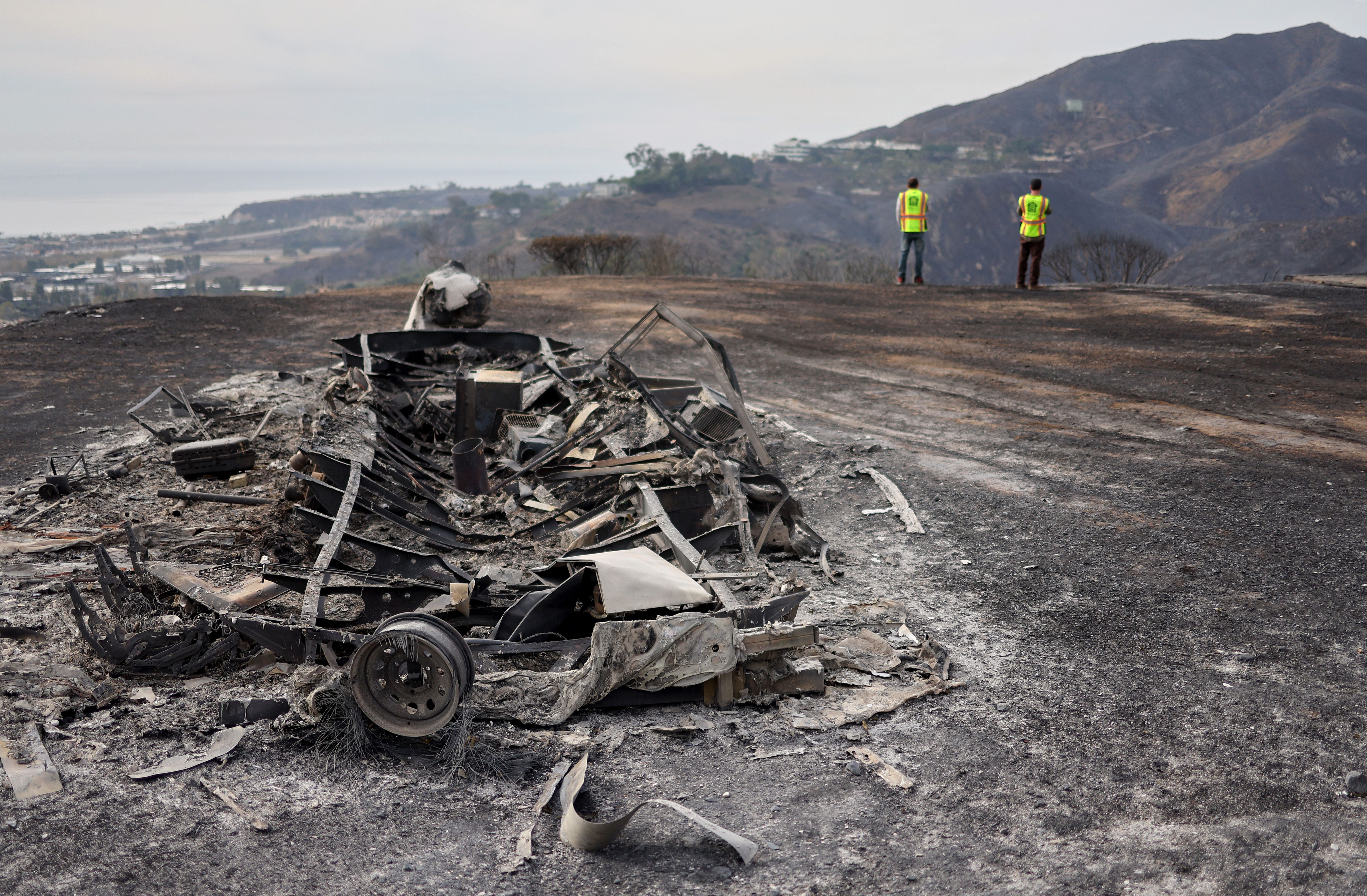 Construction workers stand in an area burned in the Franklin Fire on December 11, 2024 in Malibu, California. The wildfire has scorched 3,800 acres near Pepperdine University, destroying some homes and forcing thousands to evacuate along the coast amid high winds. (Photo by Mario Tama/Getty Images)