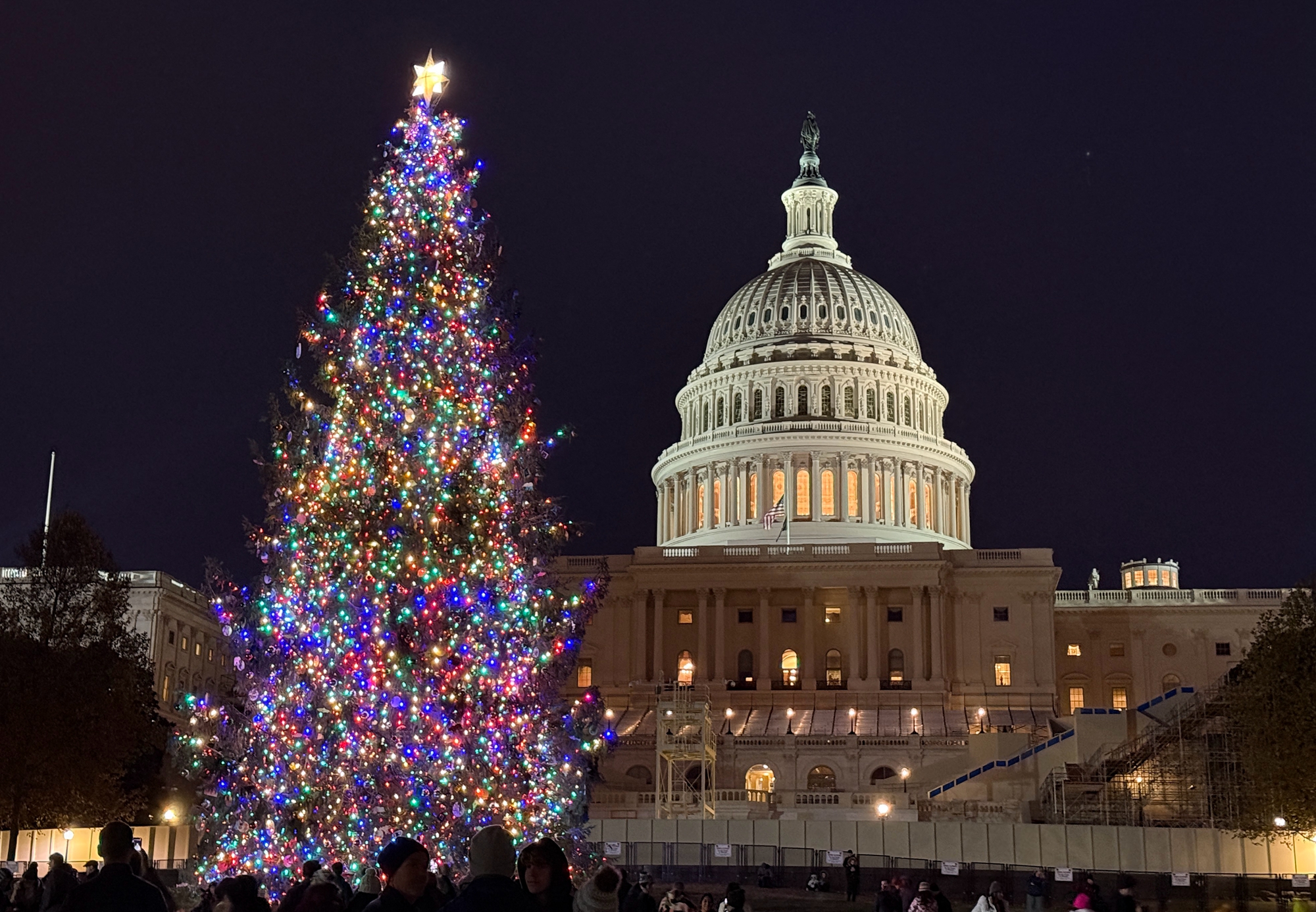 People walk by the Capitol West Lawn Christmas tree in Washington, DC, as the US capital prepares for Christmas on December 7, 2024. (Photo by Daniel Slim/AFP Photo)