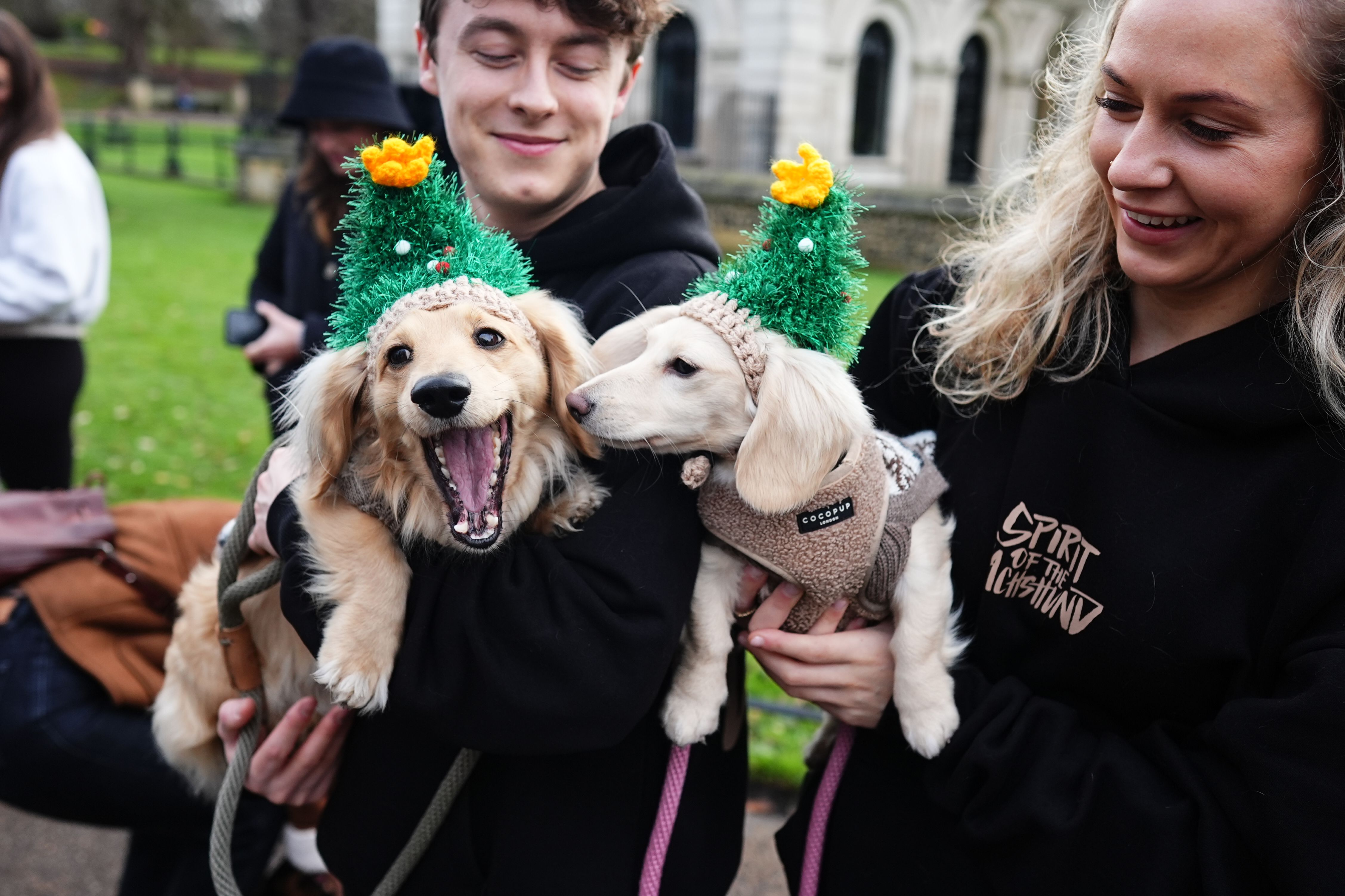 Dachshunds at the annual Hyde Park Sausage Walk in London on Sunday. December 15, 2024, as dachshunds and their owners meet up to celebrate the Christmas season, with many of the sausage dogs in fancy dress. (Photo by Aaron Chown/PA Images via Getty Images)