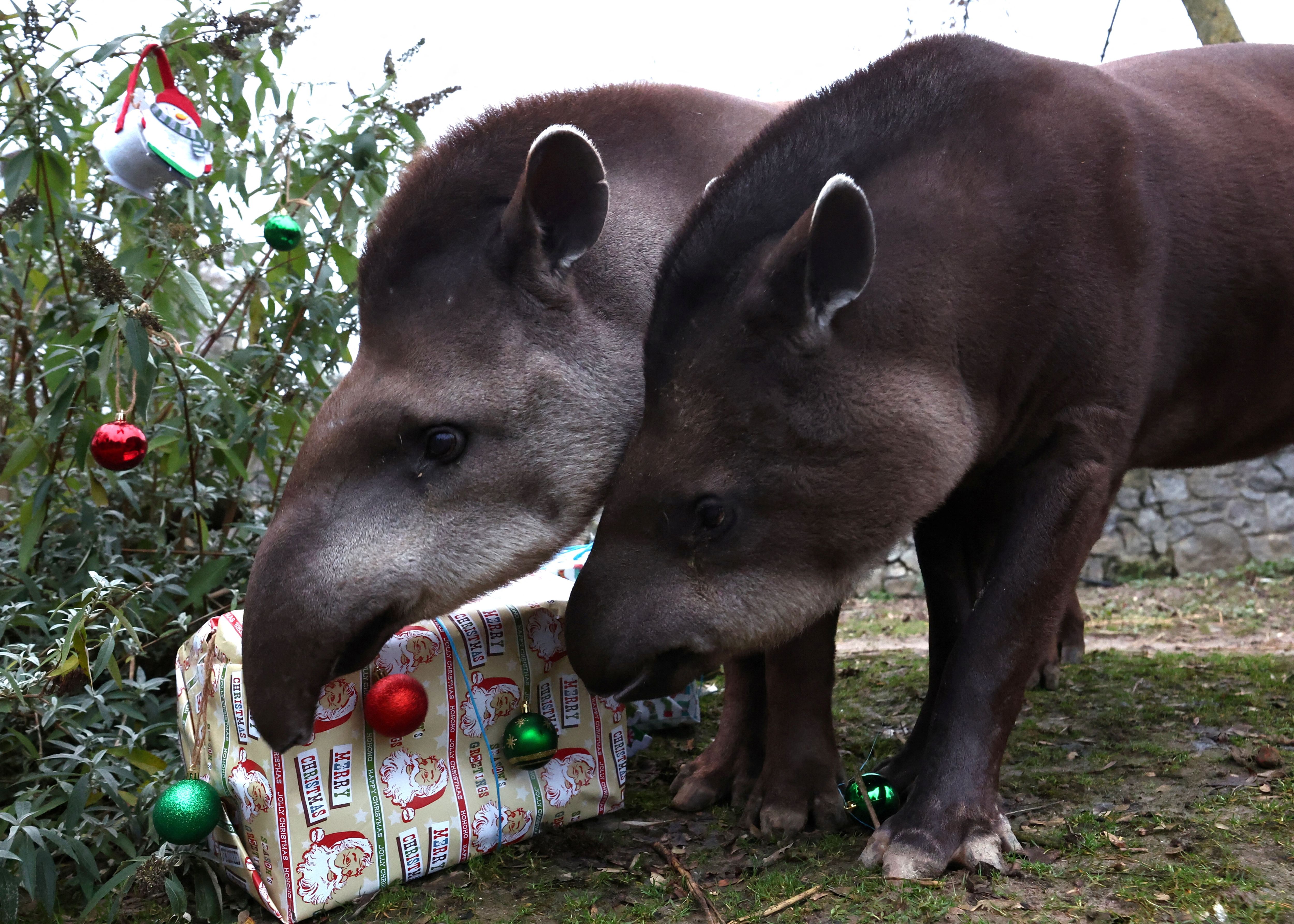 Tapirs enjoy a wrapped Christmas box containing food as part of the event “Christmas Time arrives in The Enchanted Kingdom of Animals” at Pairi Daiza animal park in Brugelette, Belgium on December 11, 2024. (Photo by Yves Herman/Reuters)