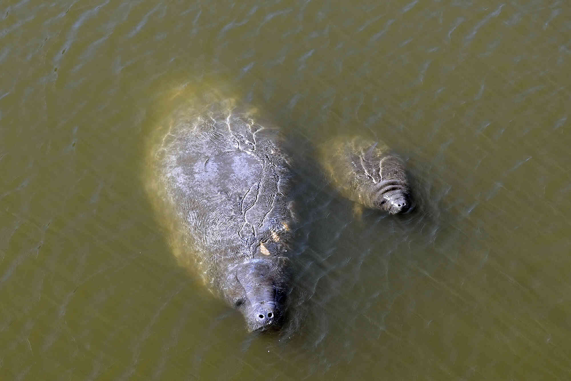 A manatee and her calf come up for air while swimming at the Tampa Electric Company manatee viewing site Tuesday, December 3, 2024, in Apollo Beach, Fla. Warm water from the power plant is discharged into the bay attracting the gentle sea creaures. (Photo by Chris O'Meara/AP Photo)