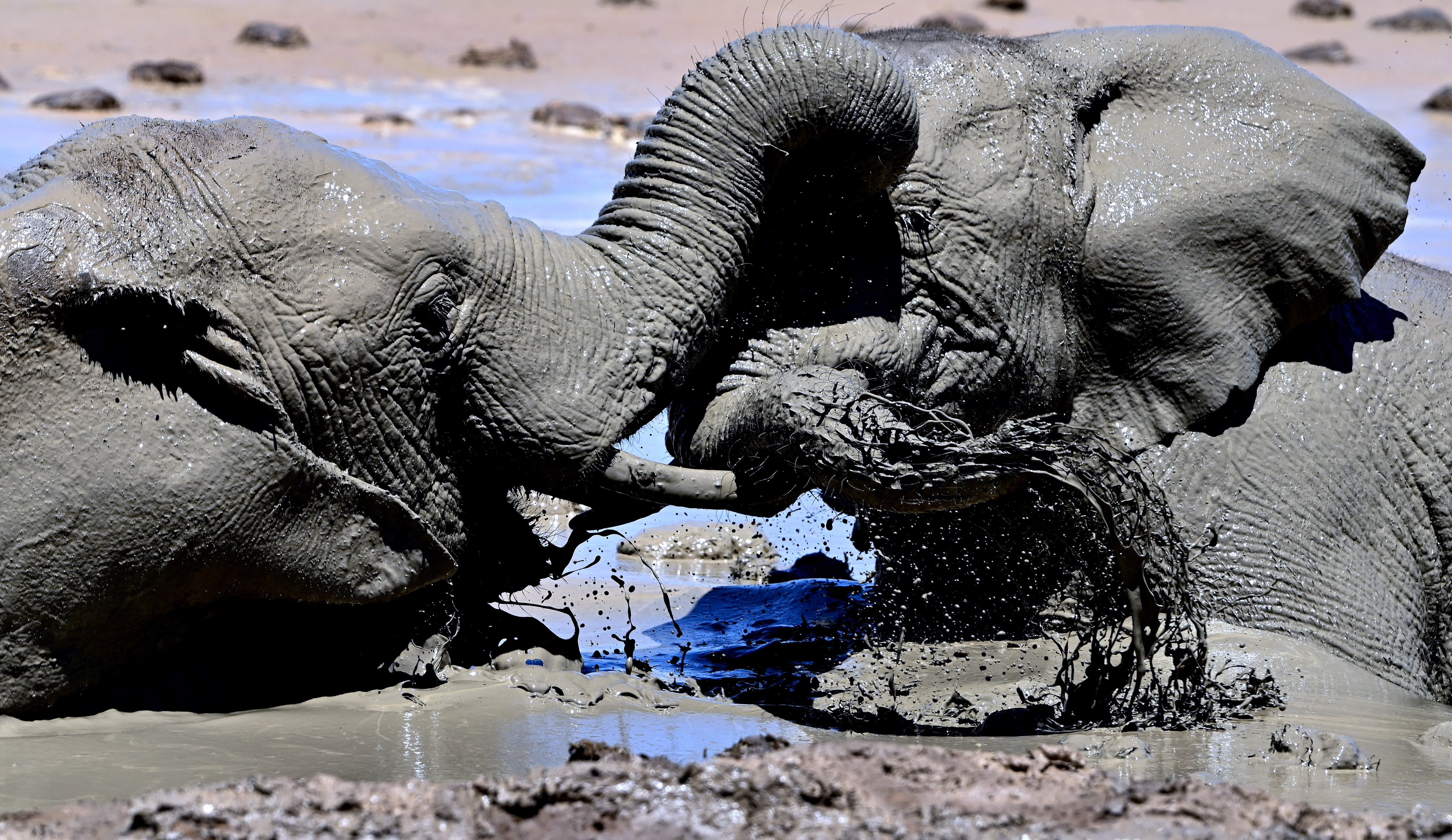Two elephants covered in mud playfully splashing each other in a waterhole in the second decade of December 2024. (Photo by Anne Laing/Caters News Agency)