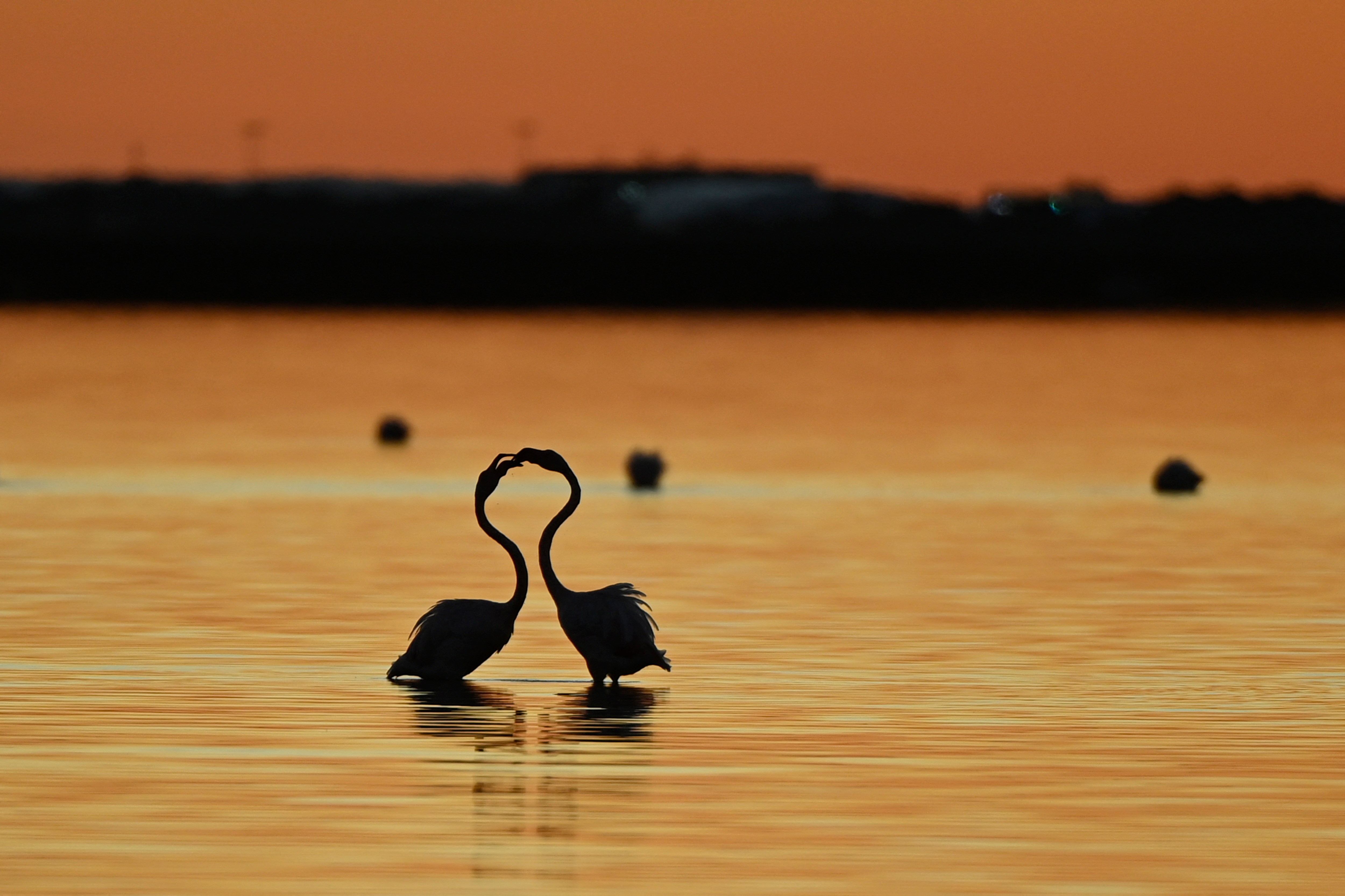 Pink flamingos are seen in the water at sunset in Perols, southern France, on December 16, 2024. (Photo by Sylvain Thomas/AFP Photo)