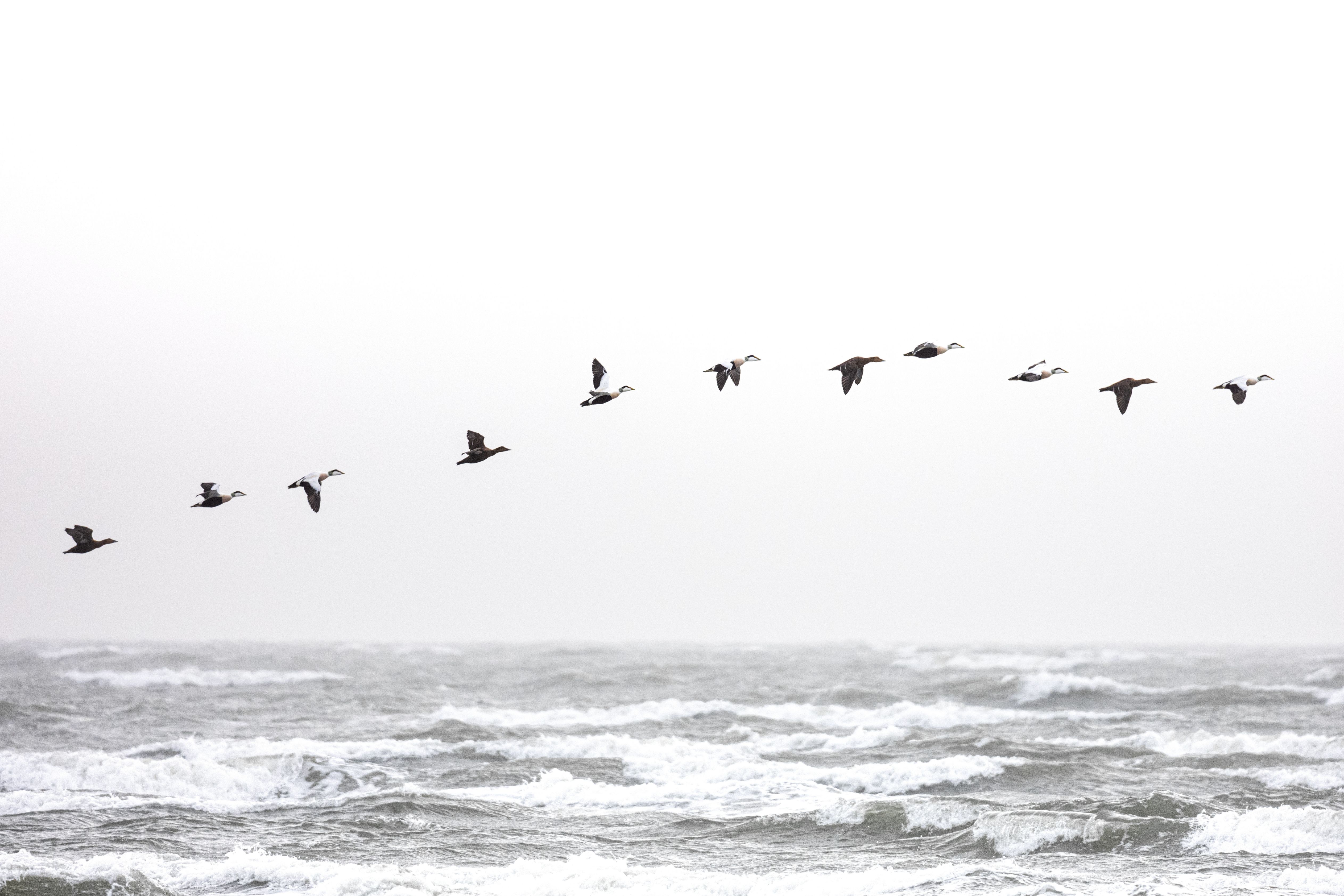 A view of Comman Eider at the coastal polar regions as some migratory birds prefer wetlands and frosted areas in Blavand, Denmark on December 4, 2024. (Photo by Alper Tuydes/Anadolu via Getty Images)